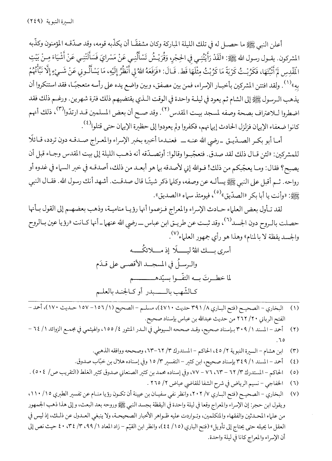 (7) البخاري- الصحيح (فتح الباري 7/ 202، وانظر نفي سفيان بن عيينة أن تكون رؤيا منام عن تفسير الطبري 15/ 110، ويقول ابن حجر: إن الإسراء والمعراج وقعا في ليلة واحدة في اليقظة بجسد النبي صلّى الله عليه وسلّم وروحه بعد البعث، وإلى هذا ذهب الجمهور من علماء المحدثين والفقهاء والمتكلمين، وتواردت عليه ظواهر الأخبار الصحيحة، ولا ينبغي العدول عن ذلك، إذ ليس في العقل ما يحيله حتى يحتاج إلى تأويل» (فتح الباري (15/ 44) ، وانظر ابن القيّم- زاد المعاد 1/ 99، 3/ 34، 40 حيث نص إلى أن الإسراء والمعراج كانا في ليلة واحدة.
