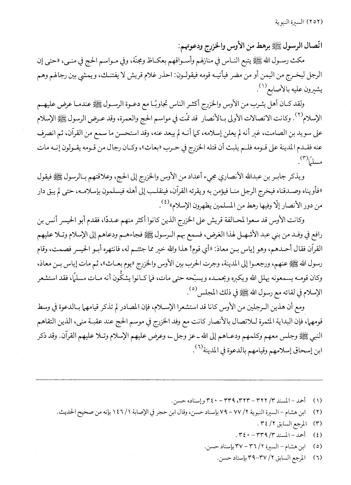 ولقد كان أهل يثرب من الأوس والخزرج أكثر الناس تجاوبا مع دعوة الرسول صلّى الله عليه وسلّم عندما عرض عليهم الإسلام «2» . وكانت الاتصالات الأولى بالأنصار قد تمّت في مواسم الحج والعمرة، وقد عرض الرسول صلّى الله عليه وسلّم الإسلام على سويد بن الصامت، غير أنه لم يعلن إسلامه، كما أنه لم يبعد عنه، وقد استحسن ما سمع من القرآن، ثم انصرف عنه فقدم المدينة على قومه فلم يلبث أن قتله الخزرج في حرب «بعاث» ، وكان رجال من قومه يقولون إنه مات مسلما «3» .