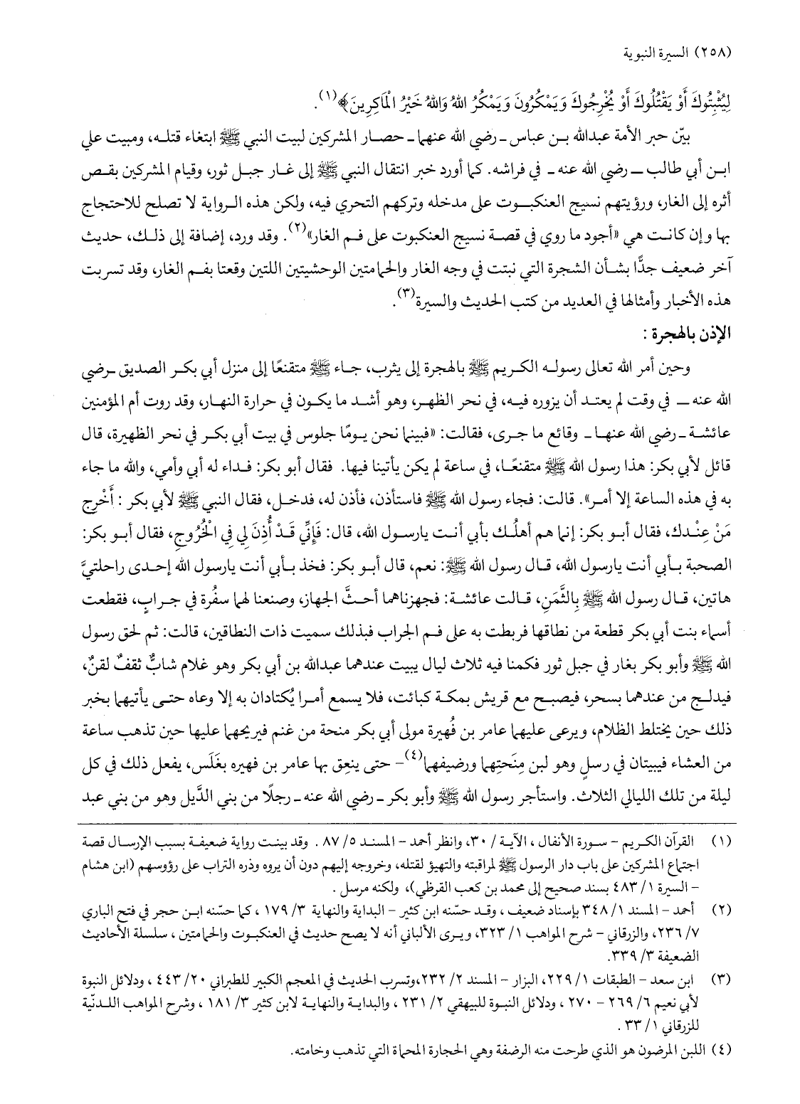 (1) القرآن الكريم- سورة الأنفال، الآية/ 30، وانظر أحمد- المسند 5/ 87. وقد بينت رواية ضعيفة بسبب الإرسال قصة اجتماع المشركين على باب دار الرسول صلّى الله عليه وسلّم لمراقبته والتهيؤ لقتله، وخروجه إليهم دون أن يروه وذره التراب على رؤوسهم (ابن هشام- السيرة 1/ 483 بسند صحيح إلى محمد بن كعب القرظي) ، ولكنه مرسل.