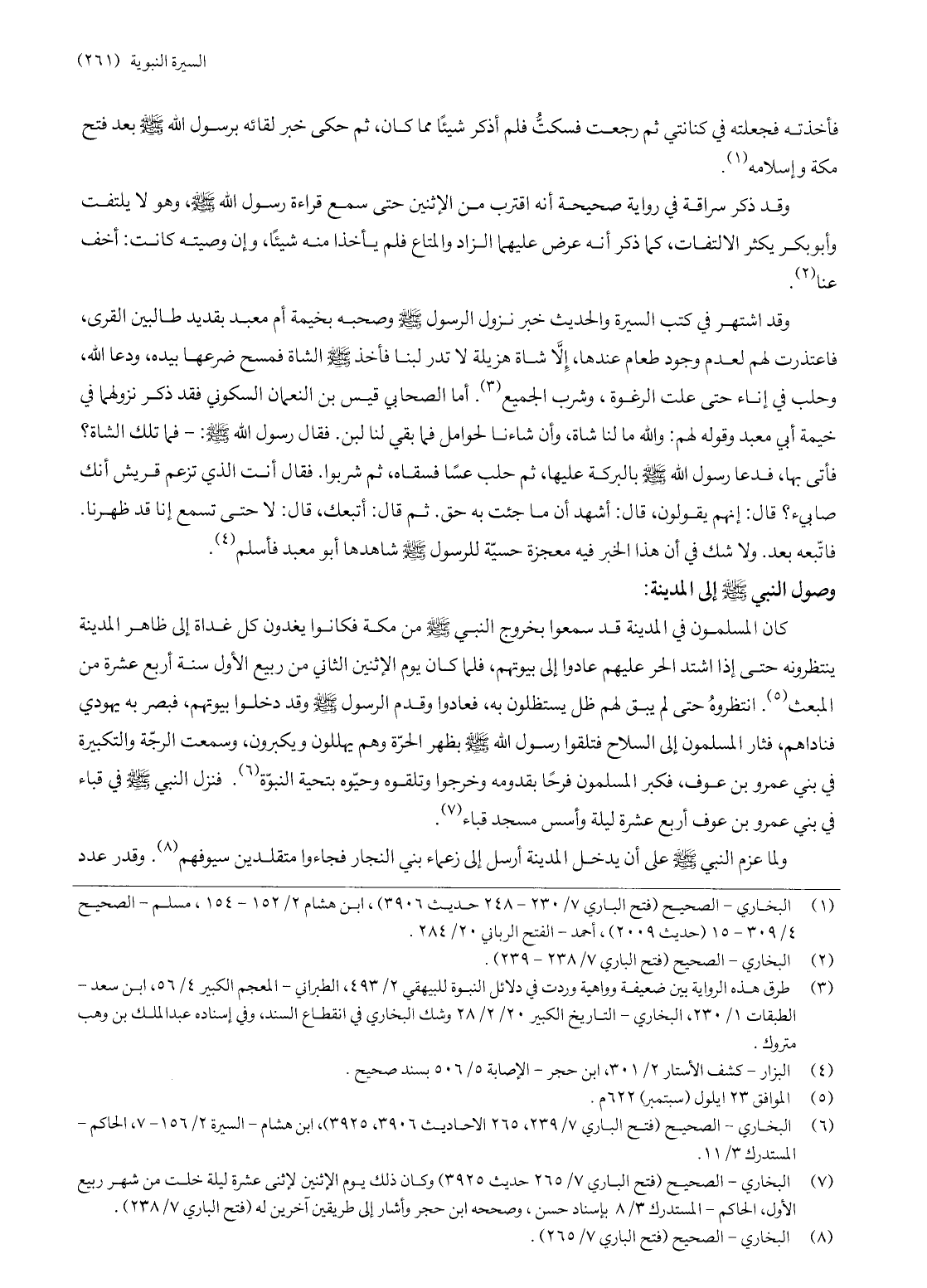 (7) البخاري- الصحيح (فتح الباري 7/ 265 حديث 3925) وكان ذلك يوم الاثنين لاثنى عشرة ليلة خلت من شهر ربيع الأول، الحاكم- المستدرك 3/ 8 بإسناد حسن، وصححه ابن حجر وأشار إلى طريقين آخرين له (فتح الباري 7/ 238) .