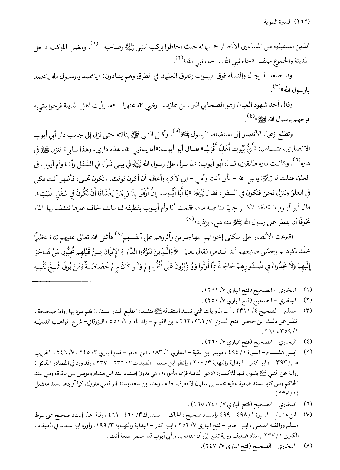 (7) ابن هشام- السيرة 1/ 498- 499 بإسناد صحيح، الحاكم- المستدرك 3/ 460- 461، وقال هذا إسناد صحيح على شرط مسلم ووافقه الذهبي، ابن حجر- فتح الباري 7/ 252، ابن كثير- البدآية والنهاية 3/ 199، وأورد ابن سعد في الطبقات الكبرى 1/ 237 بإسناد ضعيف روآية تشير إلى أن مقامه بدار أبي أيوب قد استمر سبعة أشهر.