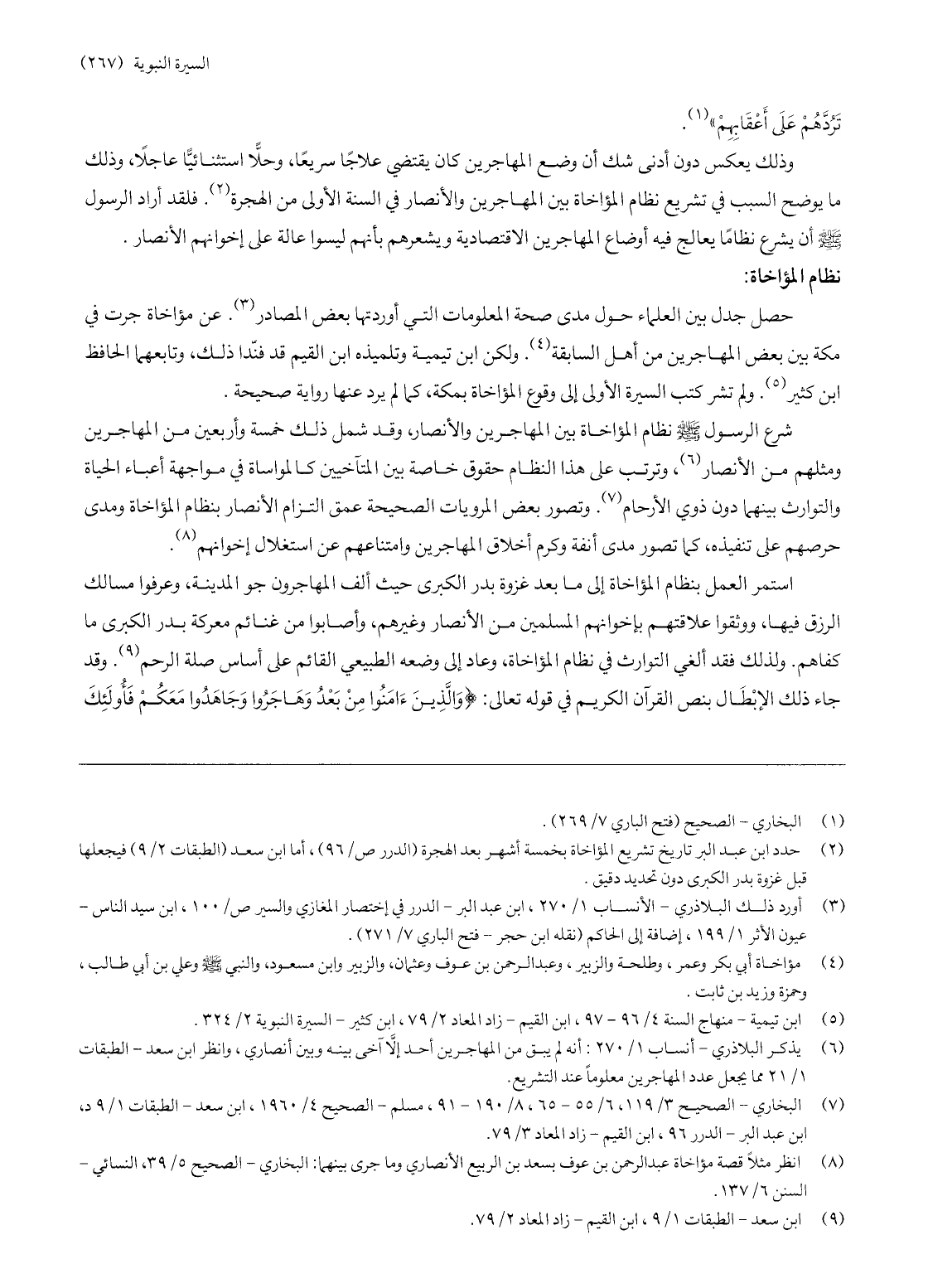 (6) انظر مثلا قصة مؤاخاة عبد الرحمن بن عوف بسعد بن الربيع الأنصاري وما جرى بينهما: البخاري- الصحيح 5/ 39، النسائي- السنن 6/ 137.