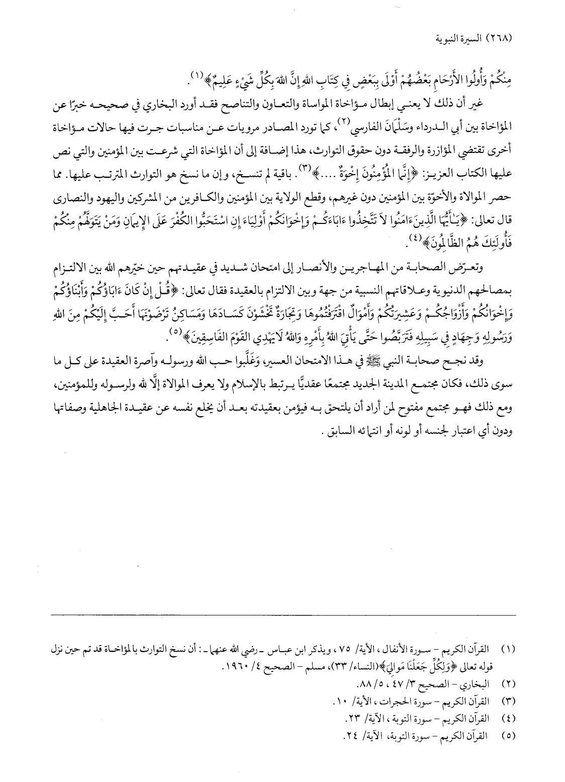 عليها الكتاب العزيز: إِنَّمَا الْمُؤْمِنُونَ إِخْوَةٌ ... «1» . باقية لم تنسخ، وأن ما نسخ هو التوارث المترتب عليها. مما حصر الموالاة والأخوّة بين المؤمنين دون غيرهم، وقطع الولاية بين المؤمنين والكافرين من المشركين واليهود والنصارى قال تعالى: يا أَيُّهَا الَّذِينَ آمَنُوا لا تَتَّخِذُوا آباءَكُمْ وَإِخْوانَكُمْ أَوْلِياءَ إِنِ اسْتَحَبُّوا الْكُفْرَ عَلَى الْإِيمانِ وَمَنْ يَتَوَلَّهُمْ مِنْكُمْ فَأُولئِكَ هُمُ الظَّالِمُونَ «2» .