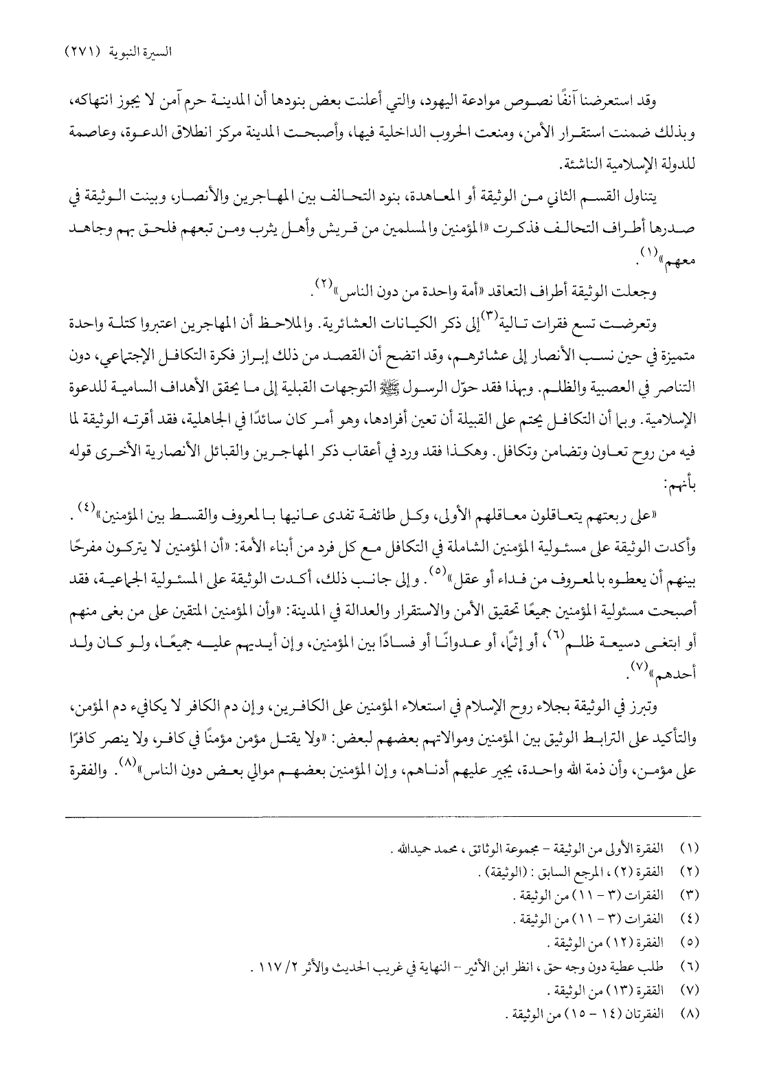 (1) الفقرة الأولى من الوثيقة- مجموعة الوثائق، محمد حميد الله.