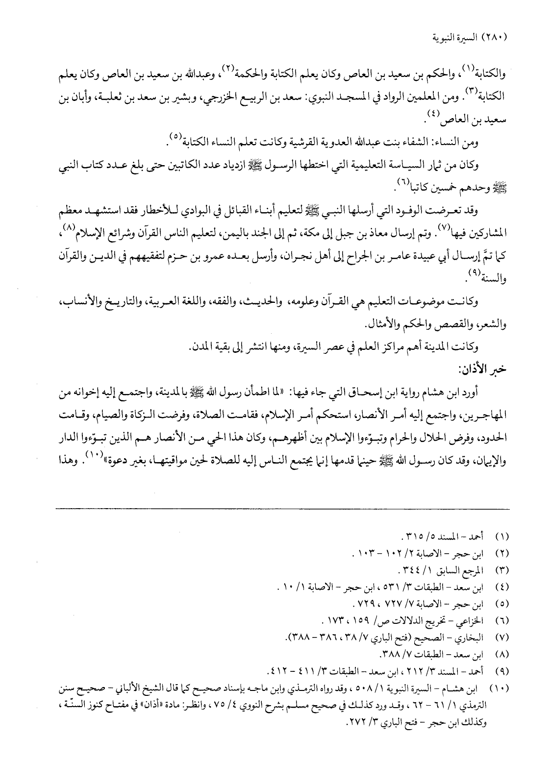 (10) ابن هشام- السيرة النبوية 1/ 508، وقد رواه الترمذي وابن ماجه بإسناد صحيح كما قال الشيخ الألباني- صحيح سنن الترمذي 1/ 61- 62، وقد ورد كذلك في صحيح مسلم بشرح النووي 4/ 75، وانظر: مادة «أذان» في مفتاح كنوز السنّة، وكذلك ابن حجر- فتح الباري 3/ 272.