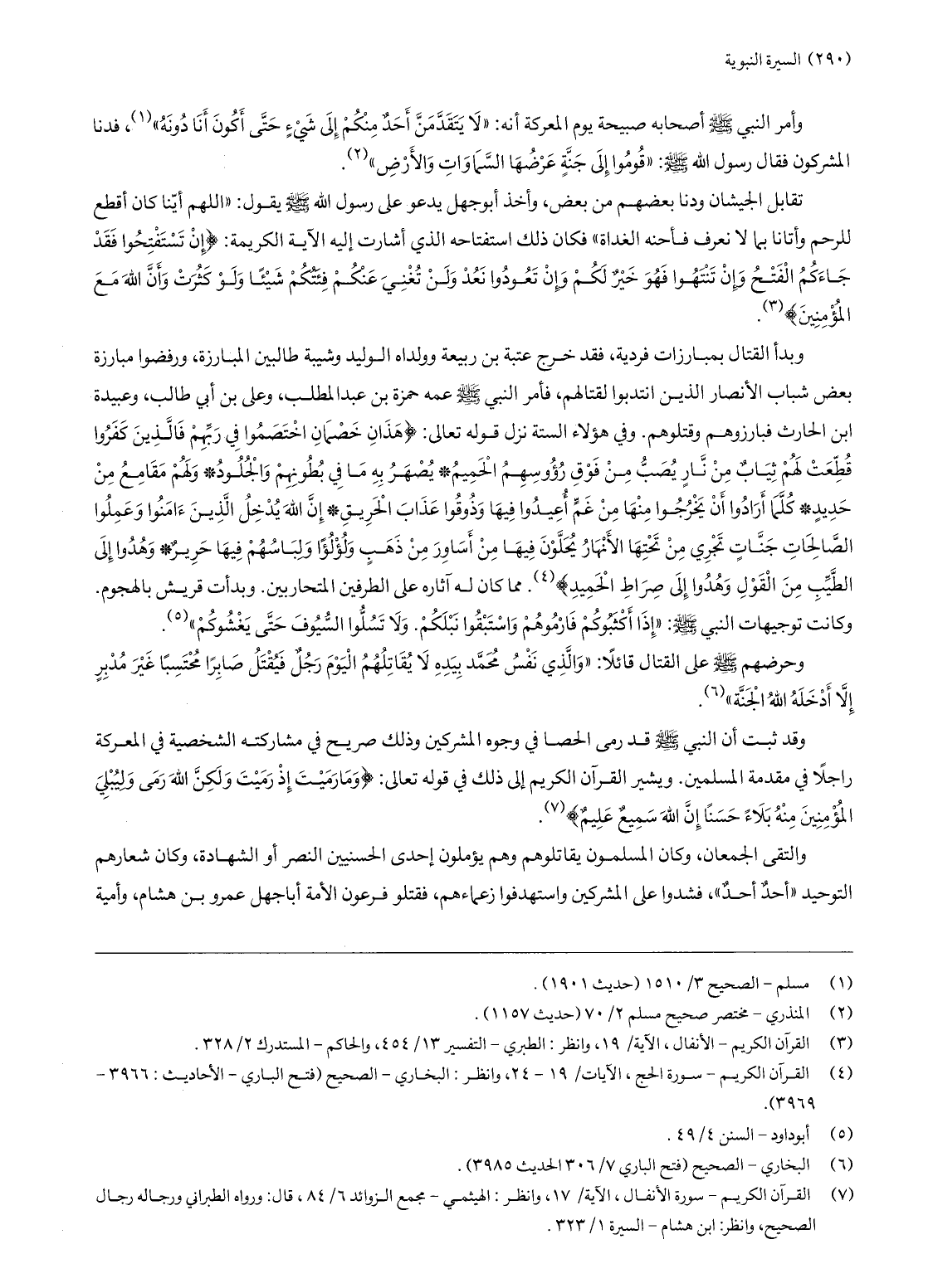وأمر النبي صلّى الله عليه وسلّم أصحابه صبيحة يوم المعركة أنه: «لا يتقدّمنّ أحد منكم إلى شيء حتّى أكون أنا دونه» «1» ، فدنا المشركون فقال رسول الله صلّى الله عليه وسلّم: «قوموا إلى جنّة عرضها السّماوات والأرض» «2» .
