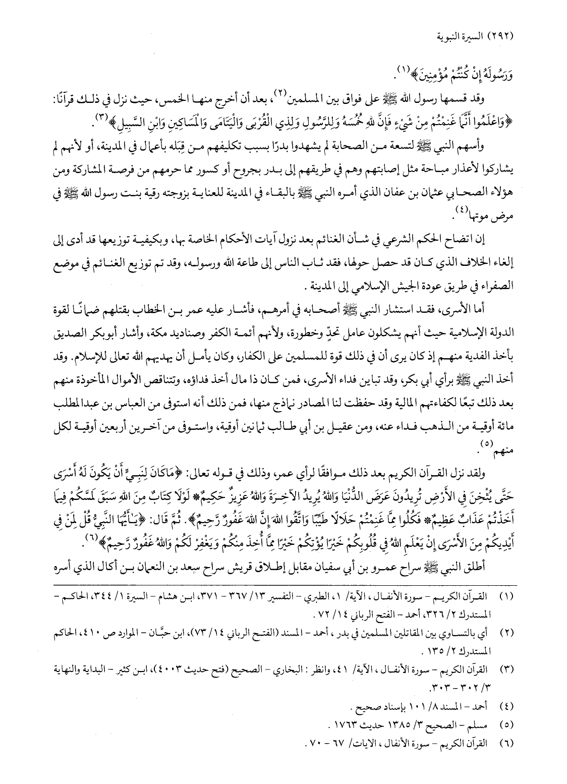 (1) القرآن الكريم- سورة الأنفال، الآية/ 1، الطبري- التفسير 13/ 367- 371، ابن هشام- السيرة 1/ 344، الحاكم- المستدرك 2/ 326، أحمد- الفتح الرباني 14/ 72.
