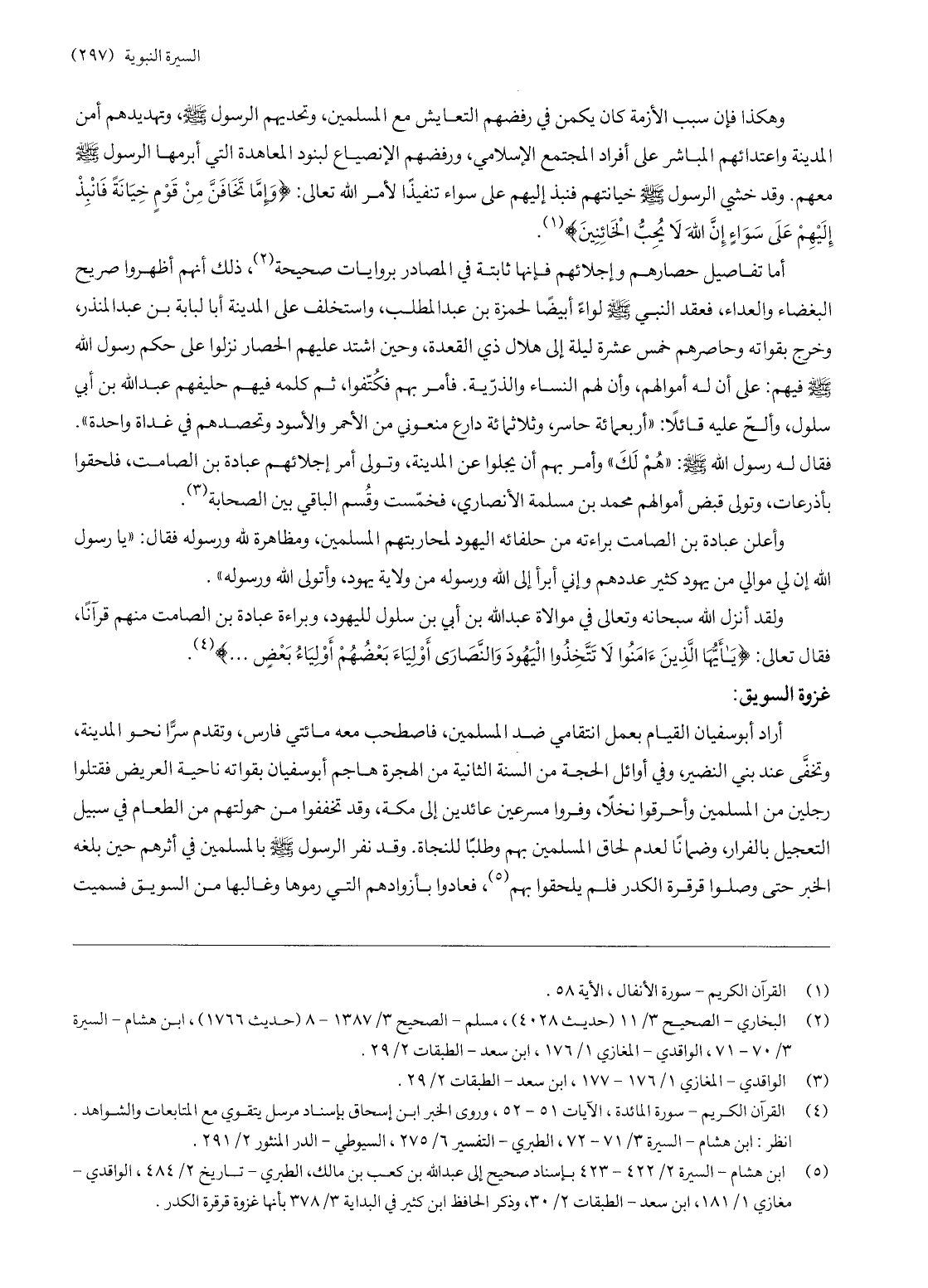 (4) القرآن الكريم- سورة المائدة، الآيات 51- 52، وروى الخبر ابن إسحاق بإسناد مرسل يتقوي مع المتابعات والشواهد. انظر: ابن هشام- السيرة 3/ 71- 72، الطبري- التفسير 6/ 275، السيوطي- الدر المنثور 2/ 291.