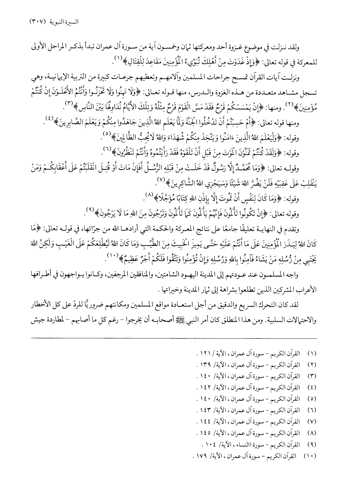 ولقد نزلت في موضوع غزوة أحد ومعركتها ثمان وخمسون آية من سورة آل عمران تبدأ بذكر المراحل الأولى للمعركة في قوله تعالى: وَإِذْ غَدَوْتَ مِنْ أَهْلِكَ تُبَوِّئُ الْمُؤْمِنِينَ مَقاعِدَ لِلْقِتالِ «1» .
