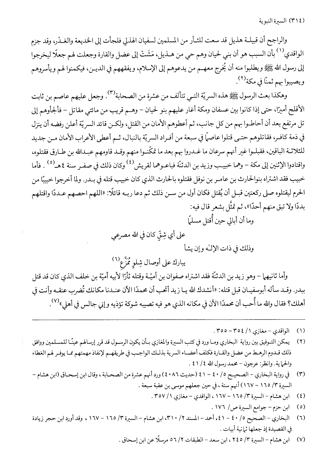 (3) في رواية البخاري- الصحيح 5/ 40- 41 (حديث 4086) ورد أنهم عشرة من الصحابة، وقال ابن إسحاق (ابن هشام- السيرة 3/ 165- 167) أنهم ستة، في حين جعلهم موسى بن عقبة سبعة.