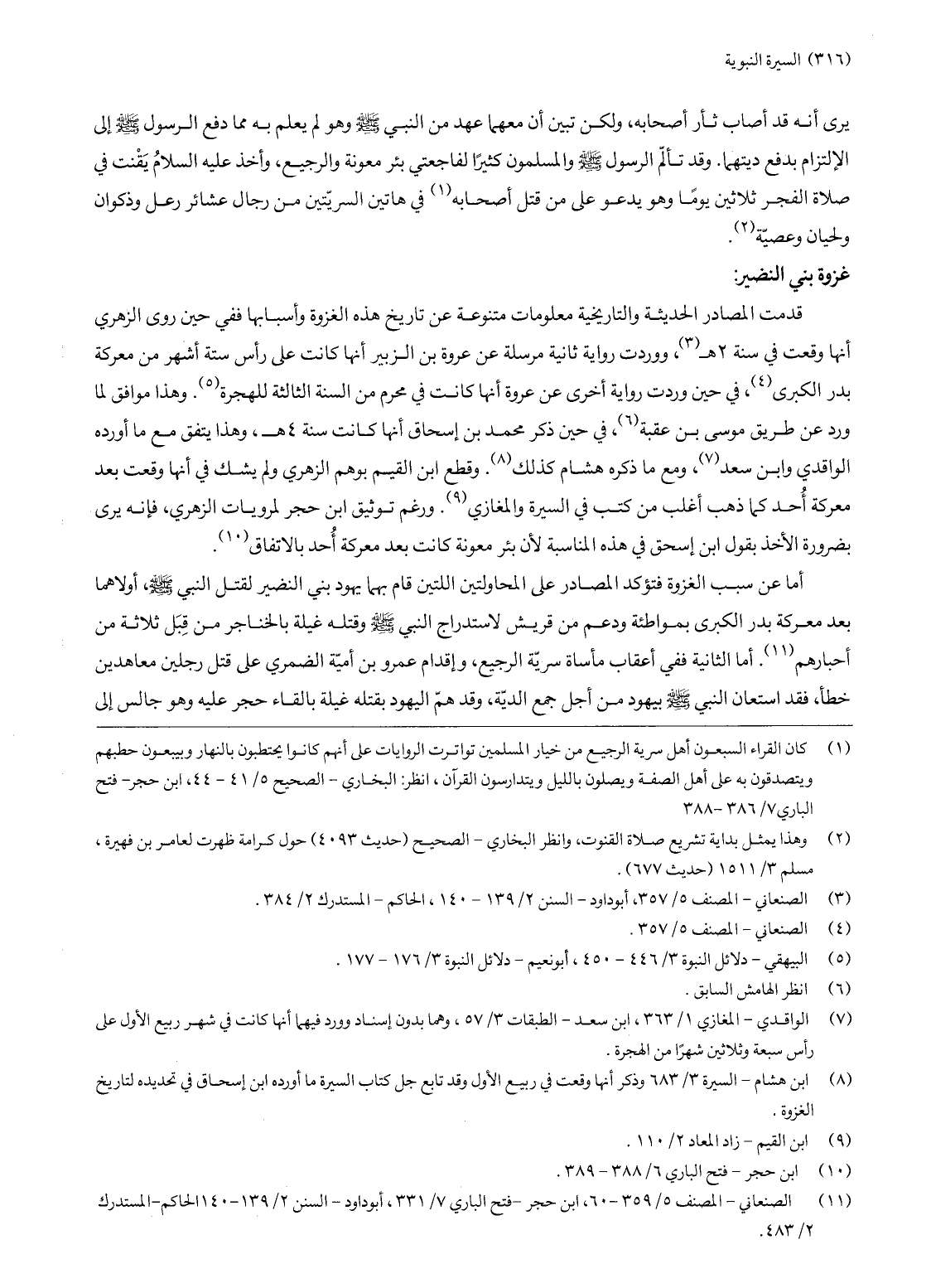 وهذا موافق لما ورد عن طريق موسى بن عقبة «6» ، في حين ذكر محمد بن إسحاق أنها كانت سنة 4 هـ، وهذا يتفق مع ما أورده الواقدي وابن سعد «7» ، ومع ما ذكره هشام كذلك «8» . وقطع ابن القيم بوهم الزهري ولم يشك في أنها وقعت بعد معركة أحد كما ذهب أغلب من كتب في السيرة والمغازي «9» . ورغم توثيق ابن حجر لمرويات الزهري، فإنه يرى بضرورة الأخذ بقول ابن إسحق في هذه المناسبة لأن بئر معونة كانت بعد معركة أحد بالاتفاق «10» .