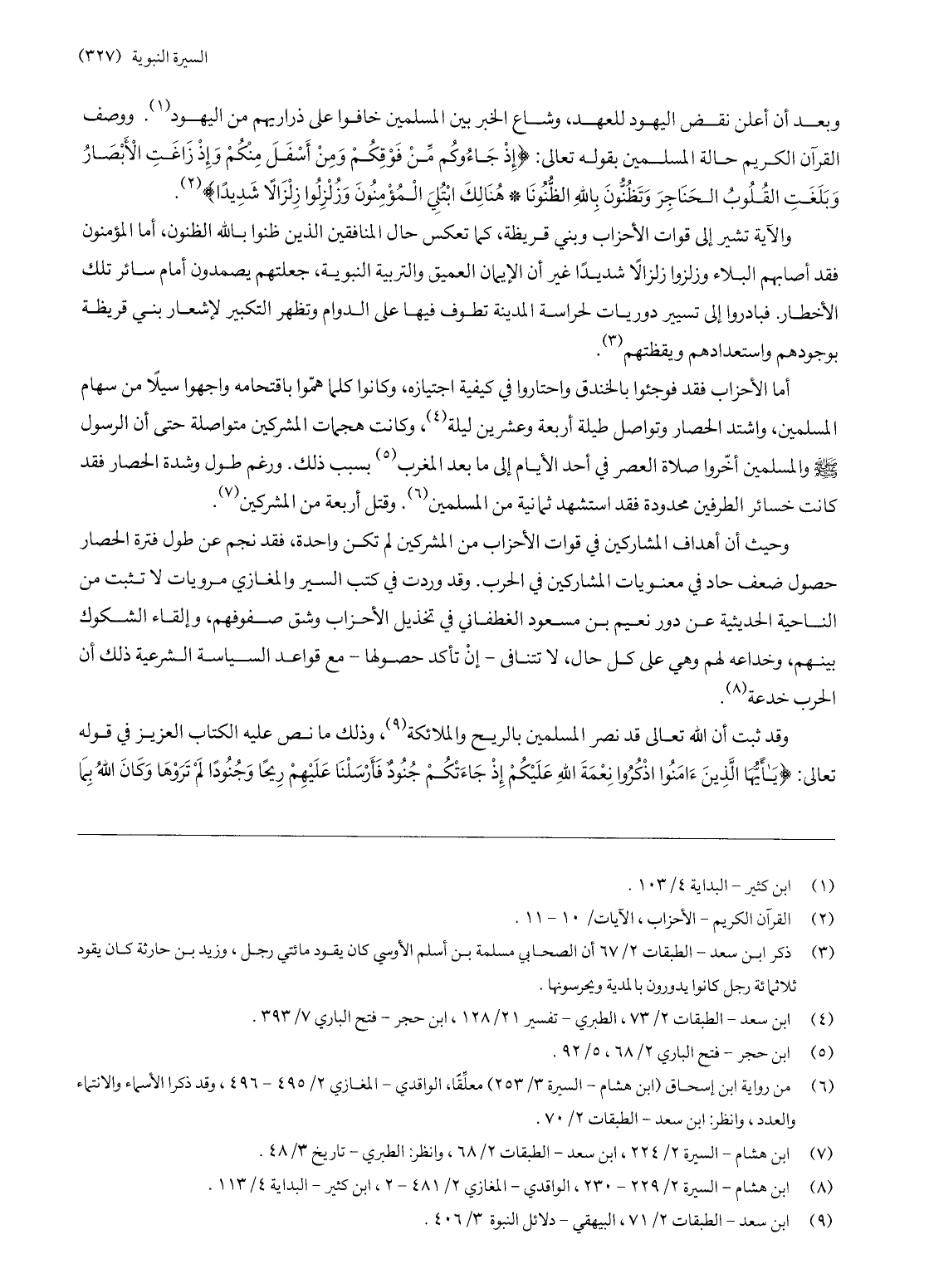 (3) ذكر ابن سعد- الطبقات 2/ 67 أن الصحابي مسلمة بن أسلم الأوسي كان يقود مائتي رجل، وزيد بن حارثة كان يقود ثلاثمائة رجل كانوا يدورون بالمدينة ويحرسونها.