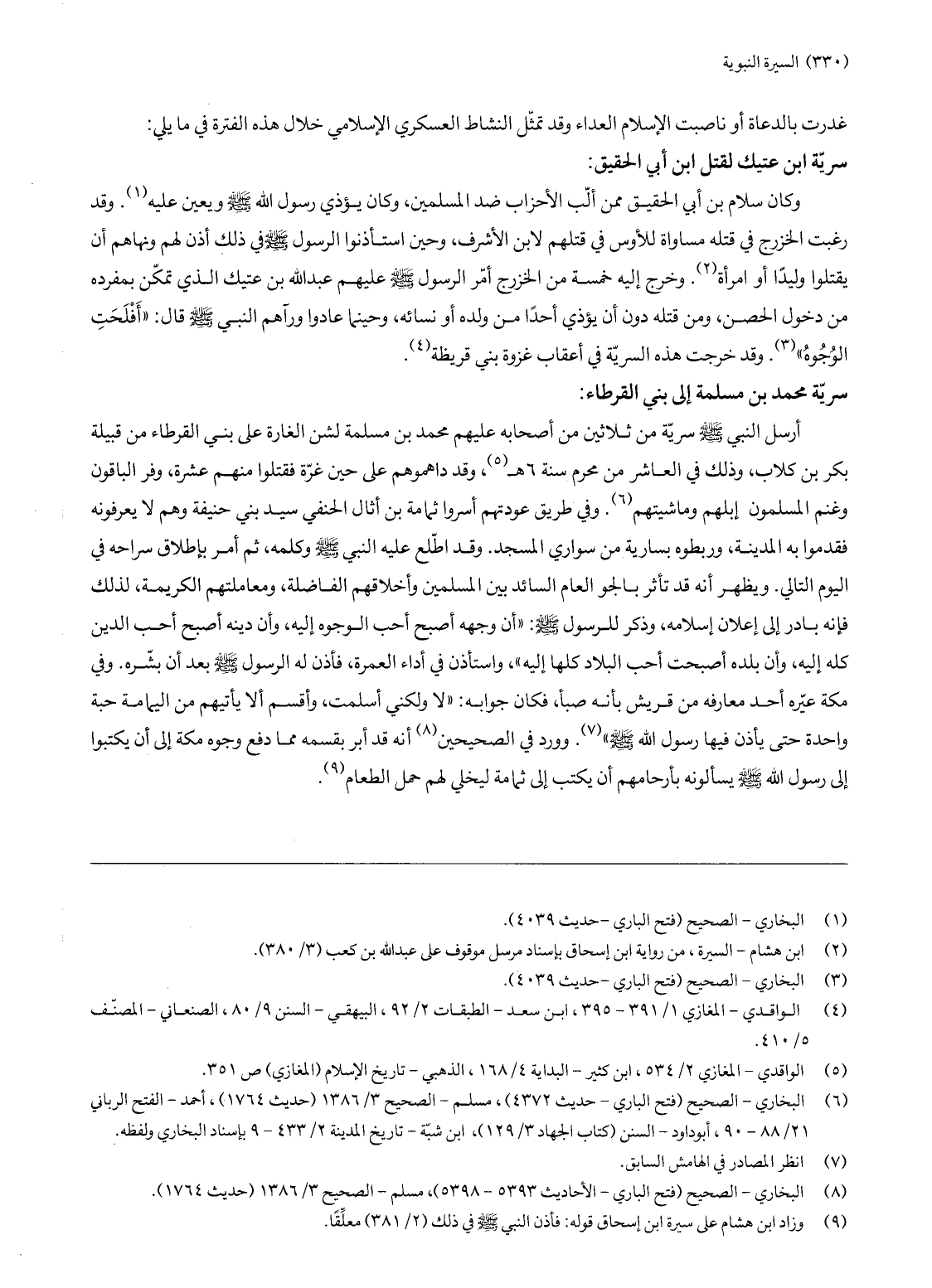 (4) الواقدي- المغازي 1/ 391- 395، ابن سعد- الطبقات 2/ 92، البيهقي- السنن 9/ 80، الصنعاني- المصنّف 5/ 41.