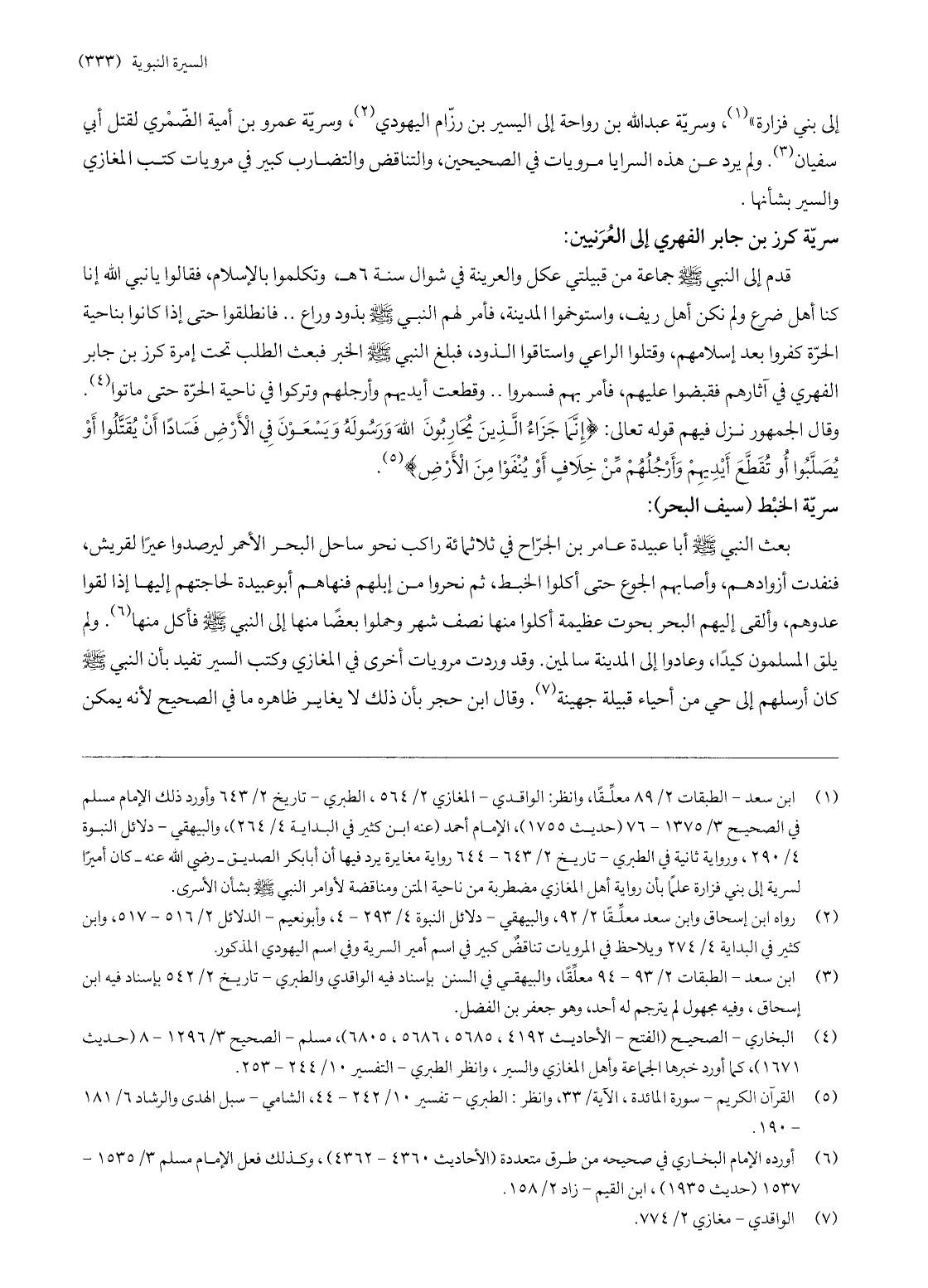 ثابت إلى بني فزارة» «1» ، وسريّة عبد الله بن رواحة إلى اليسير بن رزّام اليهودي «2» ، وسريّة عمرو بن أمية الضّمري لقتل أبي سفيان «3» . ولم يرد عن هذه السرايا مرويات في الصحيحين، والتناقض والتضارب كبير في مرويات كتب المغازي والسير بشأنها.
