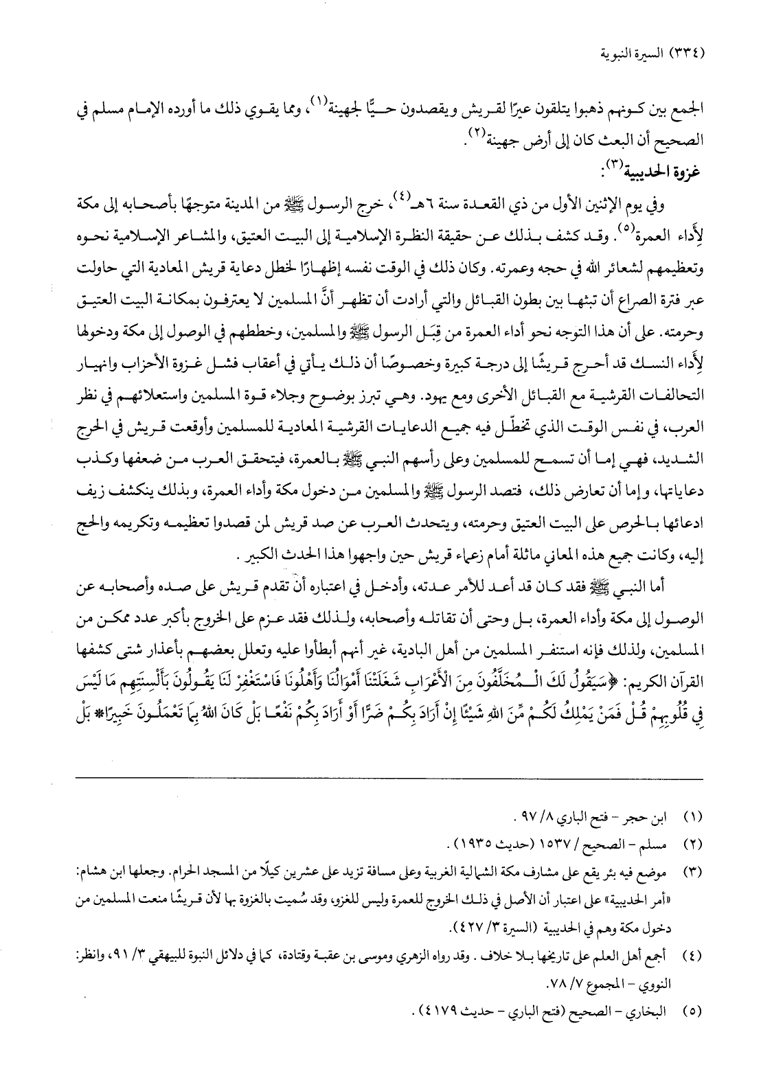 أما النبي صلّى الله عليه وسلّم فقد كان قد أعد للأمر عدته، وأدخل في اعتباره أن تقدم قريش على صده وأصحابه عن الوصول إلى مكة وأداء العمرة، بل حتى مقاتلته ومن معه، ولذلك عزم على الخروج بأكبر عدد ممكن من المسلمين، ولذلك فإنه استنفر المسلمين من أهل البادية، غير أنهم أبطئوا عليه وتعلل بعضهم بأعذار شتى كشفها القرآن الكريم: سَيَقُولُ لَكَ الْمُخَلَّفُونَ مِنَ الْأَعْرابِ شَغَلَتْنا أَمْوالُنا وَأَهْلُونا فَاسْتَغْفِرْ لَنا يَقُولُونَ بِأَلْسِنَتِهِمْ ما لَيْسَ فِي قُلُوبِهِمْ قُلْ فَمَنْ يَمْلِكُ لَكُمْ مِنَ اللَّهِ شَيْئاً إِنْ أَرادَ بِكُمْ ضَرًّا أَوْ أَرادَ بِكُمْ نَفْعاً بَلْ كانَ اللَّهُ بِما تَعْمَلُونَ خَبِيراً* بَلْ ظَنَنْتُمْ أَنْ لَنْ