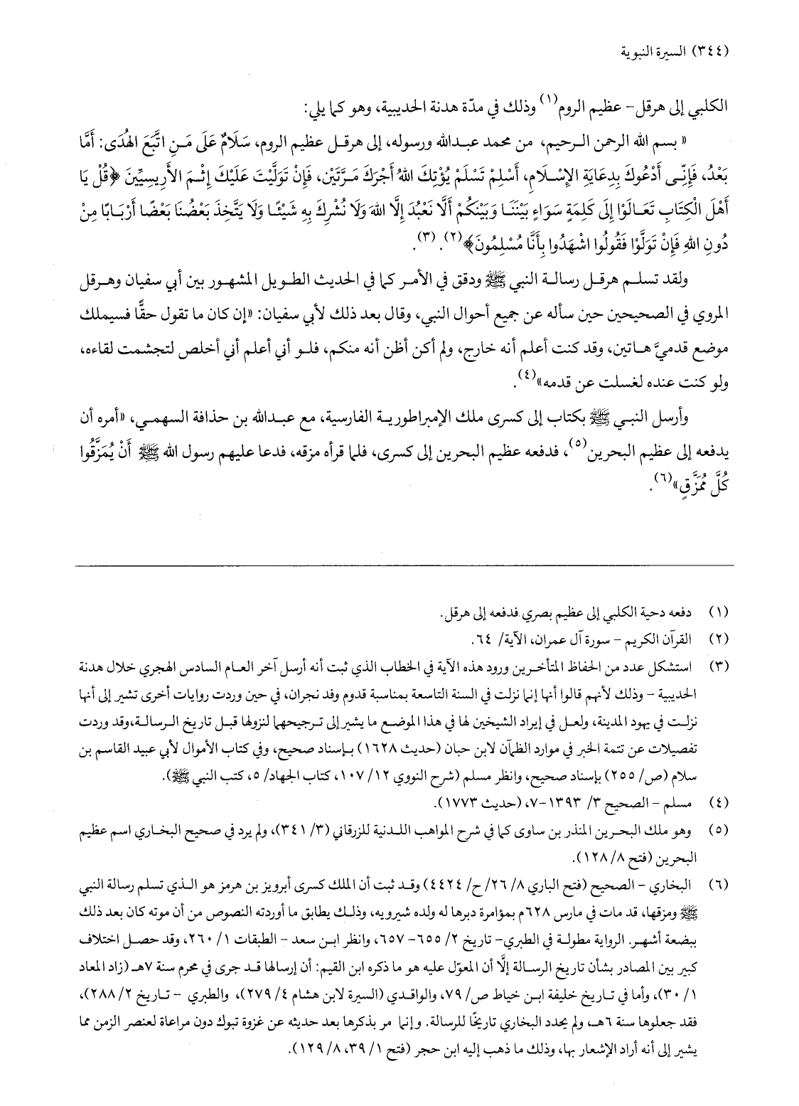 «بسم الله الرحمن الرحيم، من محمد عبد الله ورسوله، إلى هرقل عظيم الروم، سلام على من اتّبع الهدى: أمّا بعد، فإنّى أدعوك بدعاية الإسلام، أسلم تسلم يؤتك الله أجرك مرّتين، فإن تولّيت فإنّما عليك إثم الأريسيّين قُلْ يا أَهْلَ الْكِتابِ تَعالَوْا إِلى كَلِمَةٍ سَواءٍ بَيْنَنا وَبَيْنَكُمْ أَلَّا نَعْبُدَ إِلَّا اللَّهَ وَلا نُشْرِكَ بِهِ شَيْئاً وَلا يَتَّخِذَ بَعْضُنا بَعْضاً أَرْباباً مِنْ دُونِ اللَّهِ فَإِنْ تَوَلَّوْا فَقُولُوا اشْهَدُوا بِأَنَّا مُسْلِمُونَ «2» . «3» .
