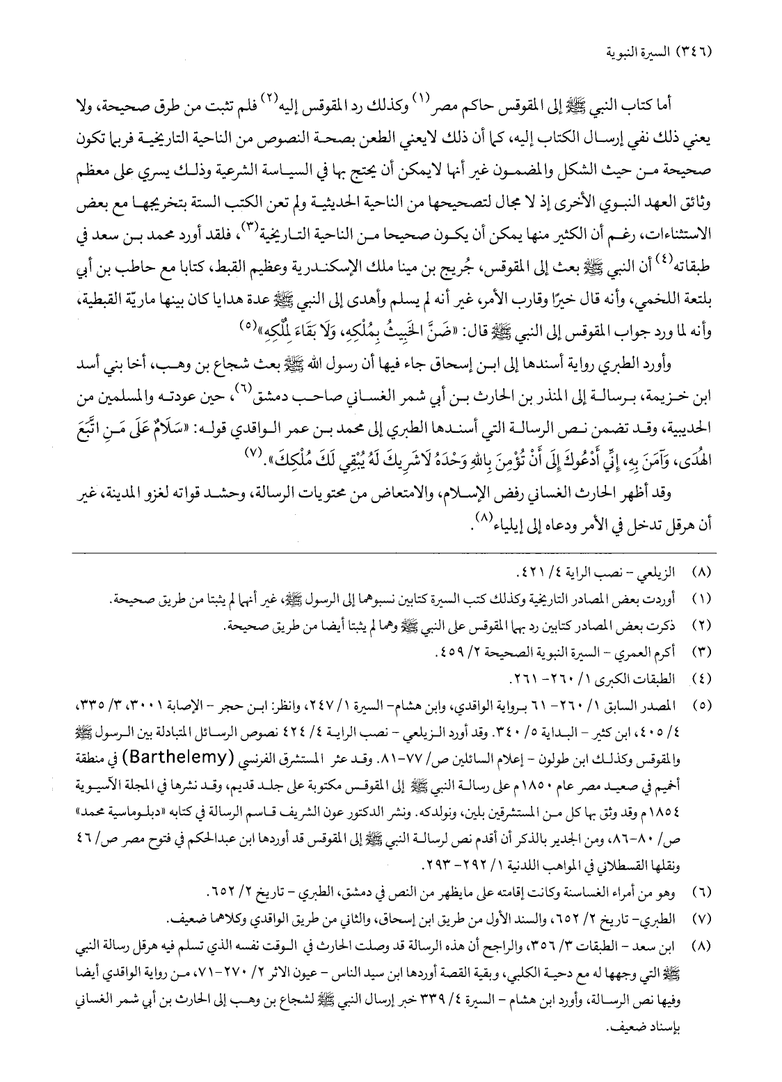 (5) المصدر السابق 1/ 260- 61 برواية الواقدي، وابن هشام- السيرة 1/ 247، وانظر: ابن حجر- الإصابة 3001، 3/ 335، 4/ 405، ابن كثير- البداية 5/ 340. وقد أورد الزيلعي- نصب الراية 4/ 424 نصوص الرسائل المتبادلة بين الرسول صلّى الله عليه وسلّم والمقوقس وكذلك ابن طولون- إعلام السائلين ص/ 77- 81. وقد عثر المستشرق الفرنسي (ymelehtraB) في منطقة أخميم في صعيد مصر عام 1850 م على رسالة النبي صلّى الله عليه وسلّم إلى المقوقس مكتوبة على جلد قديم، وقد نشرها في المجلة الآسيوية 1854 م وقد وثق بها كل من المستشرقين بلين، ونولدكه. ونشر الدكتور عون الشريف قاسم الرسالة في كتابه «دبلوماسية محمد» ص/ 80- 86، ومن الجدير بالذكر أن أقدم نص لرسالة النبي صلّى الله عليه وسلّم إلى المقوقس قد أوردها ابن عبد الحكم في فتوح مصر ص/ 46 ونقلها القسطلاني في المواهب اللدنية 1/ 292- 293.