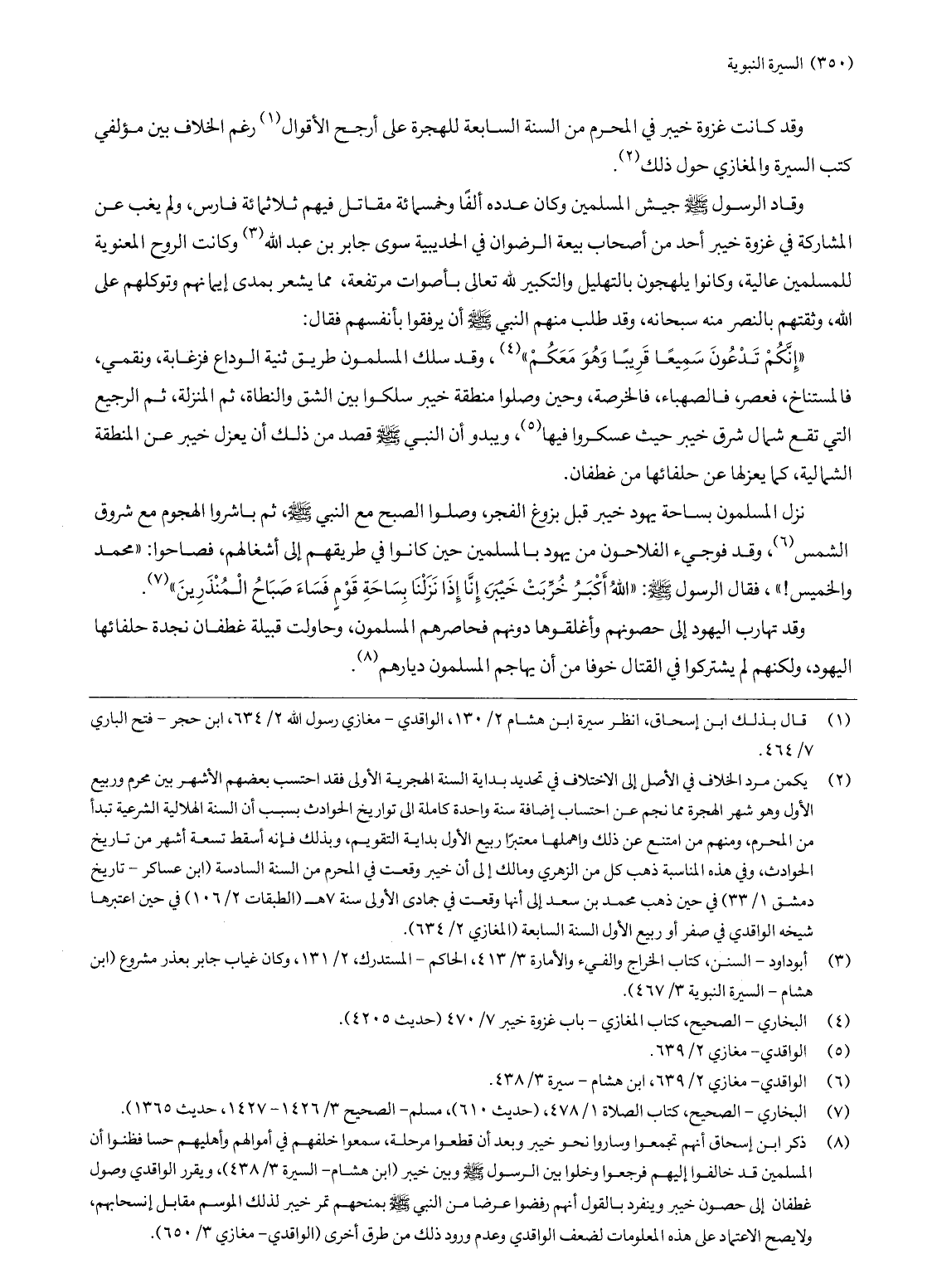 (2) يكمن مرد الخلاف في الأصل إلى الاختلاف في تحديد بداية السنة الهجرية الأولى فقد احتسب بعضهم الأشهر بين محرم وربيع الأول وهو شهر الهجرة مما نجم عن احتساب إضافة سنة واحدة كاملة الى تواريخ الحوادث بسبب أن السنة الهلالية الشرعية تبدأ من المحرم، ومنهم من امتنع عن ذلك واهملها معتبرا ربيع الأول بداية التقويم، وبذلك فإنه أسقط تسعة أشهر من تاريخ الحوادث، وفي هذه المناسبة ذهب كل من الزهري ومالك إلى أن خيبر وقعت في المحرم من السنة السادسة (ابن عساكر- تاريخ دمشق 1/ 33) في حين ذهب محمد بن سعد إلى أنها وقعت في جمادى الأولى سنة 7 هـ (الطبقات 2/ 106) في حين اعتبرها شيخه الواقدي في صفر أو ربيع الأول السنة السابعة (المغازي 2/ 634) .
