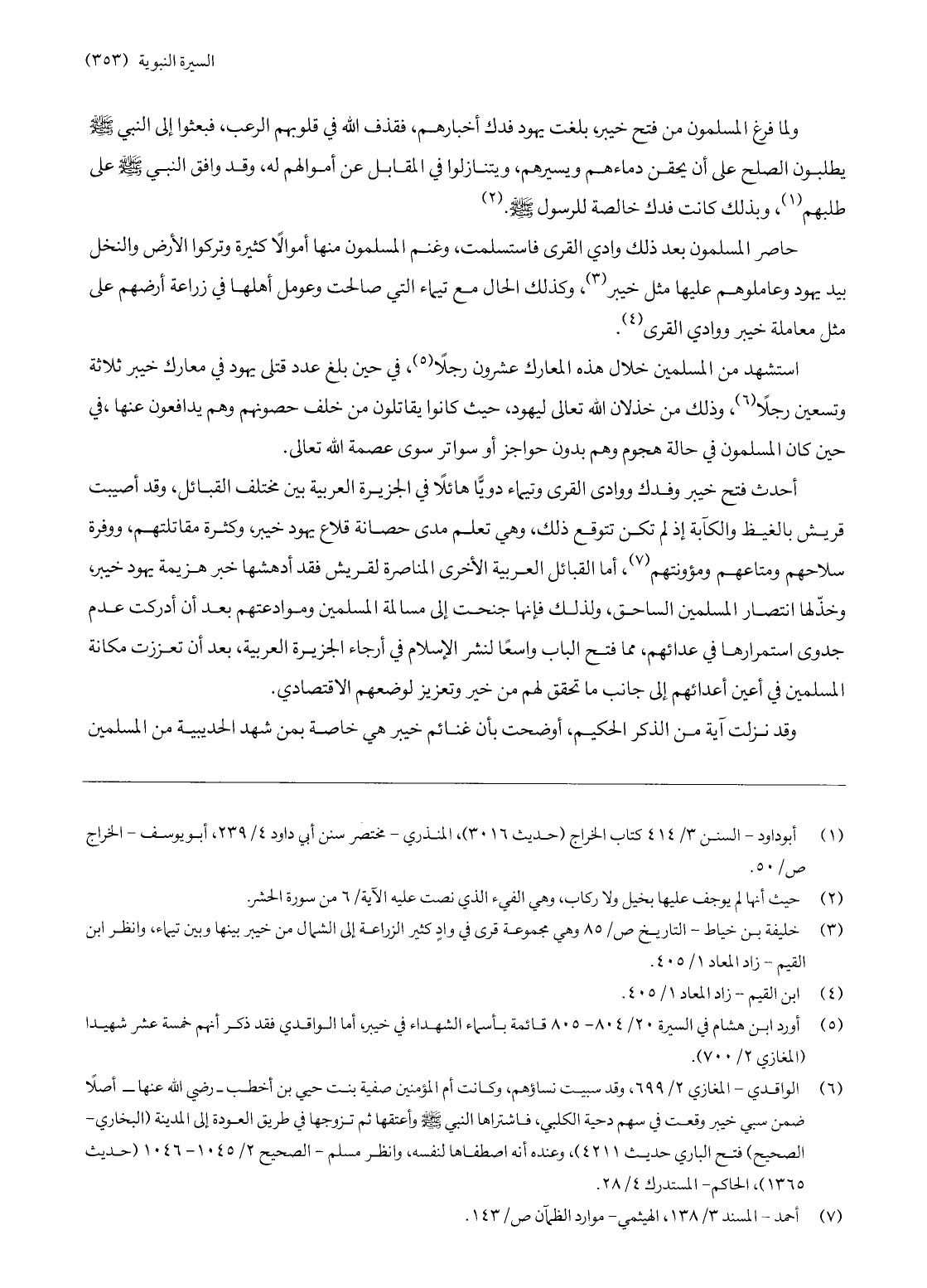 (6) الواقدي- المغازي 2/ 699، وقد سبيت نساؤهم، وكانت أم المؤمنين صفية بنت حيي بن أخطب- رضي الله عنها- أصلا ضمن سبي خيبر وقعت في سهم دحية الكلبي، فاشتراها النبي صلّى الله عليه وسلّم وأعتقها ثم تزوجها في طريق العودة إلى المدينة (البخاري- الصحيح) فتح الباري حديث 4211) ، وعنده أنه اصطفاها لنفسه، وانظر مسلم- الصحيح 2/ 1045- 1046 (حديث 1365) ، الحاكم- المستدرك 4/ 28.