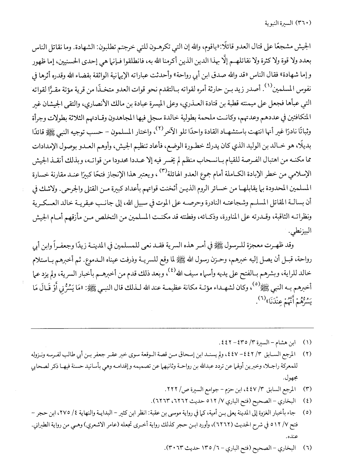 (2) المرجع السابق 3/ 442- 447، ولم يسند ابن إسحاق من قصة الوقعة سوى خبر عقر جعفر بن أبي طالب لفرسه ونزوله للمعركة راجلا، وخبرين أولهما عن تردد عبد الله بن رواحة وثانيهما عن تصميمه وإقدامه وهي بأسانيد حسنة فيها ذكر لصحابي مجهول.