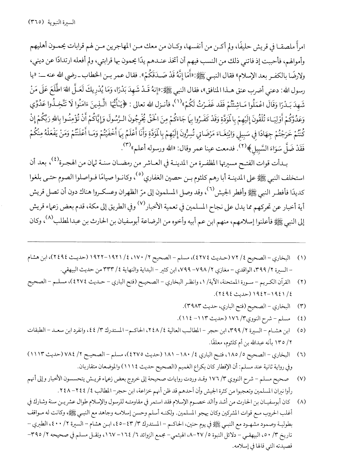 (7) صحيح مسلم- شرح النووي 3/ 176 وقد وردت روايات صحيحة بخروج بعض زعماء قريش يتحسسون الأخبار وإلى أنهم رأوا نيران المسلمين وتعجبوا من كثرة الجيش وأن أحدهم قد ظن أنهم خزاعة، ابن حجر- المطالب 4/ 244- 248.