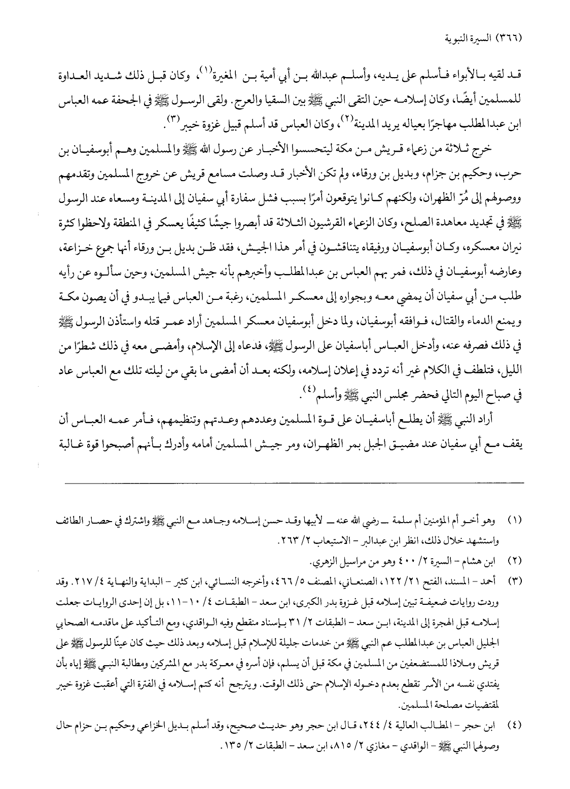 (3) أحمد- المسند، الفتح 21/ 122، الصنعاني، المصنف 5/ 466، وأخرجه النسائي، ابن كثير- البداية والنهاية 4/ 217. وقد وردت روايات ضعيفة تبين إسلامه قبل غزوة بدر الكبرى، ابن سعد- الطبقات 4/ 10- 11، بل إن إحدى الروايات جعلت إسلامه قبل الهجرة إلى المدينة، ابن سعد- الطبقات 2/ 31 بإسناد منقطع وفيه الواقدي، ومع التأكيد على ما قدمه الصحابي الجليل العباس بن عبد المطلب عم النبي صلّى الله عليه وسلّم من خدمات جليلة للإسلام قبل إسلامه وبعد ذلك حيث كان عينا للرسول صلّى الله عليه وسلّم على قريش وملاذا للمستضعفين من المسلمين في مكة قبل أن يسلم، فإن أسره في معركة بدر مع المشركين ومطالبة النبي صلّى الله عليه وسلّم إياه بأن يفتدي نفسه من الأسر تقطع بعدم دخوله الإسلام حتى ذلك الوقت. ويترجح أنه كتم إسلامه في الفترة التي أعقبت غزوة خيبر لمقتضيات مصلحة المسلمين.