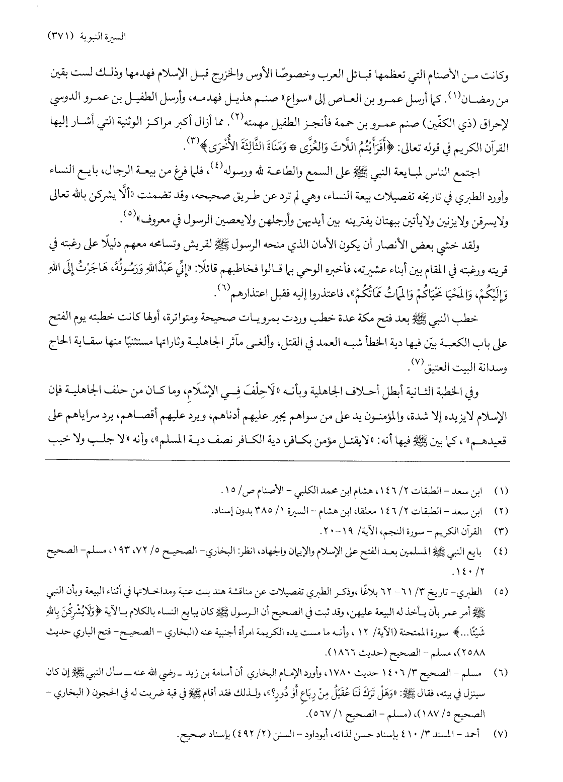 (5) الطبري- تاريخ 3/ 61- 62 بلاغا، وذكر الطبري تفصيلات عن مناقشة هند بنت عتبة ومداخلاتها في أثناء البيعة وبأن النبي صلّى الله عليه وسلّم أمر عمر بأن يأخذ له البيعة عليهن، وقد ثبت في الصحيح أن الرسول صلّى الله عليه وسلّم كان يبايع النساء بالكلام بالآية ولا يُشْرِكْنَ بِاللَّهِ شَيْئاً ... سورة الممتحنة (الآية/ 12، وأنه ما مست يده الكريمة امرأة أجنبية عنه (البخاري- الصحيح- فتح الباري حديث 2588) ، مسلم- الصحيح (حديث 1866) .