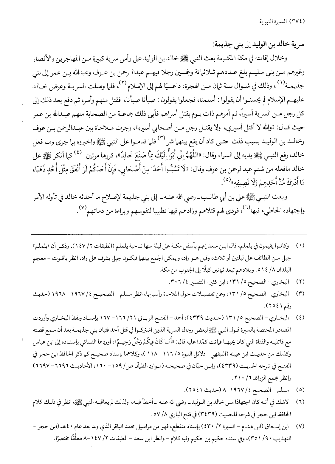 (6) لا شك في أنه كان اجتهادا من خالد بن الوليد- رضي الله عنه- أخطأ فيه، ولذلك لم يعاقبه النبي صلّى الله عليه وسلّم، انظر في ذلك كلام الحافظ ابن حجر في شرحه للحديث (3439) في فتح الباري 8/ 57.