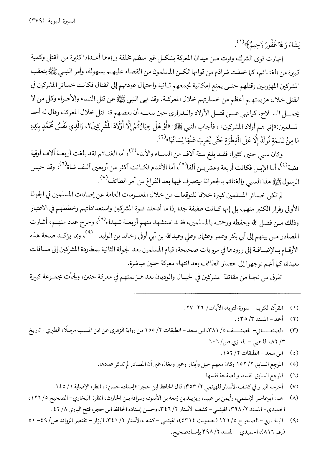وكان سبي حنين كثيرا، فقد بلغ ستة آلاف من النساء والأبناء «3» ، أما الغنائم فقد بلغت أربعة آلاف أوقية فضة «4» ، أما الإبل فكانت أربعة وعشرين ألفا»