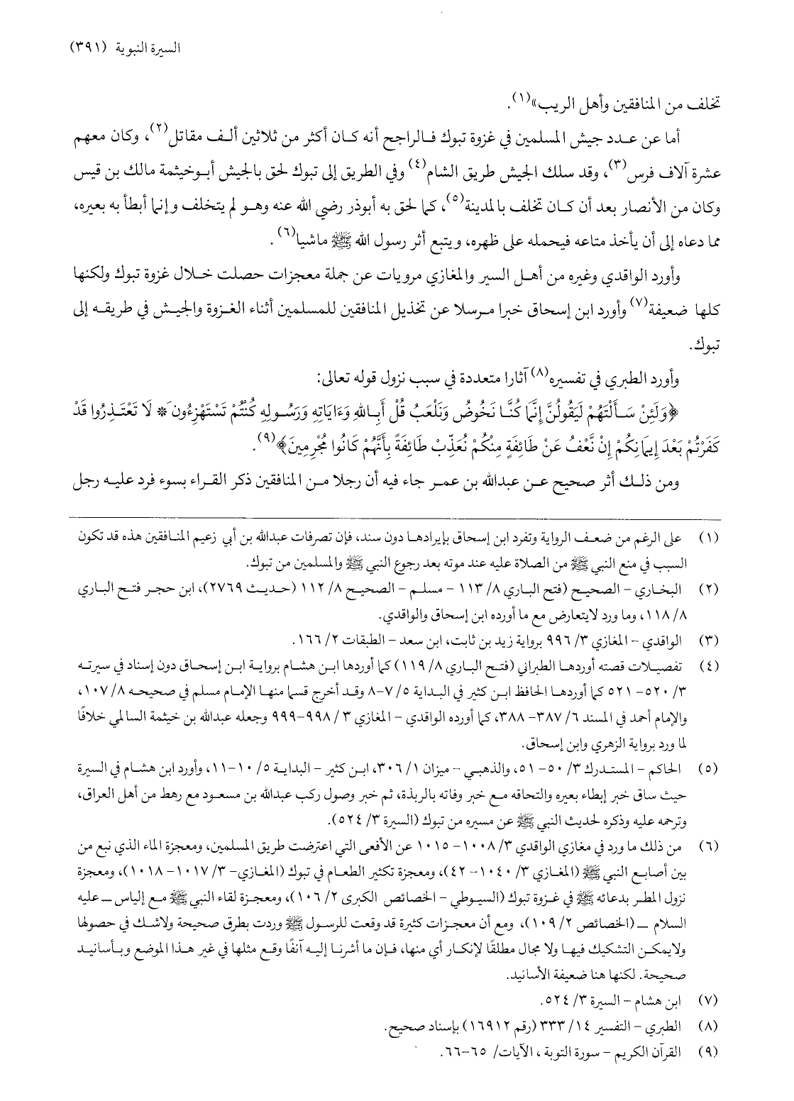 وأورد الواقدي وغيره من أهل السير والمغازي مرويات عن جملة معجزات حصلت خلال غزوة تبوك ولكنها كلها ضعيفة «7» وأورد ابن إسحاق خبرا مرسلا عن تخذيل المنافقين للمسلمين أثناء الغزوة والجيش في طريقه إلى تبوك.