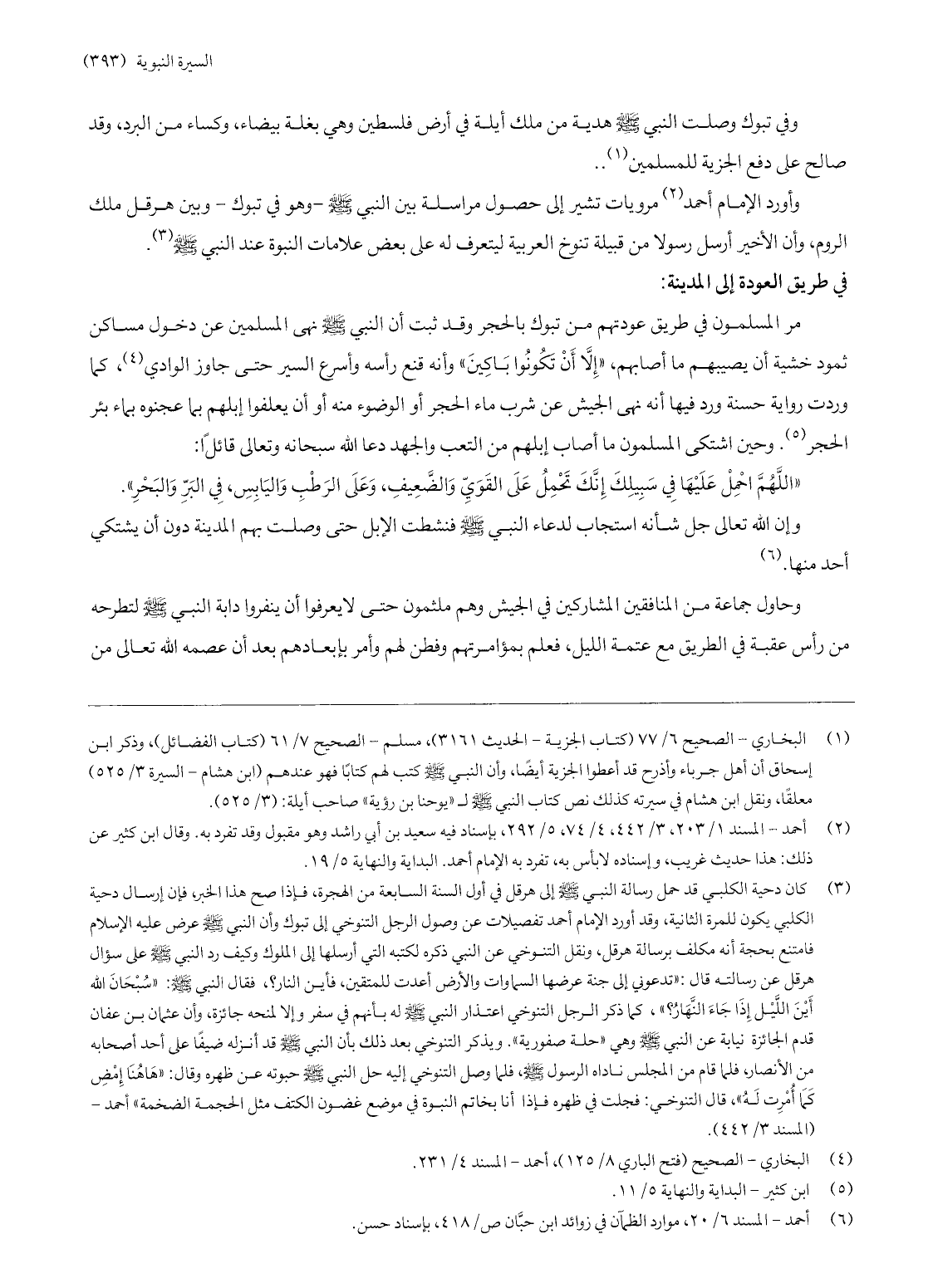 مر المسلمون في طريق عودتهم من تبوك بالحجر وقد ثبت أن النبي صلّى الله عليه وسلّم نهى المسلمين عن دخول مساكن ثمود خشية أن يصيبهم ما أصابهم، «إلّا أن تكونوا باكين» ، وأنه قنع رأسه وأسرع السير حتى جاوز الوادي «4» ، كما وردت رواية حسنة، ورد فيها أنه نهى الجيش عن شرب ماء الحجر أو الوضوء منه أو أن يعلفوا إبلهم بما عجنوه بماء بئر الحجر «5» . وحين اشتكى المسلمون ما أصاب إبلهم من التعب والجهد دعا الله سبحانه وتعالى قائلا: «اللهمّ احمل عليها في سبيلك إنّك تحمل على القويّ والضّعيف، وعلى الرطب واليابس، في البرّ والبحر» .