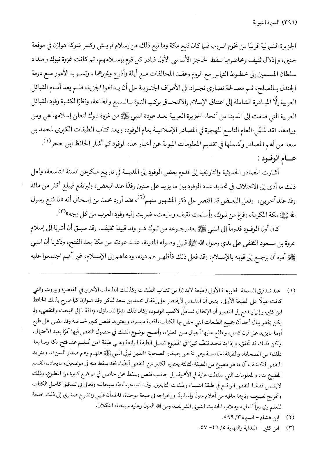 (1) عند تدقيق النسخة المطبوعة الأولى (طبعة لايدن) من كتاب الطبقات وكذلك الطبعات الأخرى في القاهرة وبيروت والتي كانت عيالا على الطبعة الأولى، يتبين أن النقص لا يقتصر على إغفال محمد بن سعد لذكر وفد هوازن كما صرح بذلك الحافظ ابن كثير، وإنما يدفع إلى التصور أن الإغفال شامل لأغلب الوفود، وكان ذلك مثيرا للتساؤل، ودافعا إلى البحث والتقصي، ولم يكن يخطر ببال أحد أن جميع الطبعات التي حفل بها الكتاب ناقصة مبتسرة، ويعتورها نقص كبير، خاصة وقد مضى على طبع أولها ما يزيد على قرن كامل، واطلع عليها أجيال من العلماء، وأصبح موضوع الشك في حصول النقص فيها أمرا بعيد الاحتمال، ولكن ذلك قد تحقق، وإذا بنا نجد نقصا كبيرا في المطبوع شمل الطبقة الرابعة وهي طبقة «من أسلم عند فتح مكة وما بعد ذلك» من الصحابة، والطبقة الخامسة وهي تختص بصغار الصحابة «الذين توفي النبي صلّى الله عليه وسلّم عنهم وهم صغار السن» ،. ويتزايد النقص لنكتشف أن ما هو مطبوع من الطبقة الثالثة يعتوره الكثير من النقص أيضا، فقد سقط منه في موضعين، ما يعادل القسم المطبوع منه، والمعلومات التي سقطت غاية في الأهمية، إلى جانب نقص وسقط مخل حاصل في مواضع كثيرة من المطبوع، وذلك لا يشمل قطعا النقص الواقع في طبقة النساء وطبقات التابعين. وقد استخرت الله سبحانه وتعالى في تدقيق كامل الكتاب وتخريج نصوصه وترجمة ما فيه من أعلام متونا وأسانيد وإخراجه في طبعة موحدة، فاطمأن قلبي وانشرح صدري إلى ذلك خدمة للعلم وتيسيرا للعلماء وطلاب الحديث النبوي الشريف، ومن الله العون وعليه سبحانه التكلان.