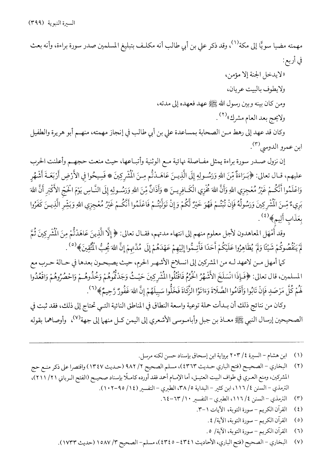 (2) البخاري- الصحيح (فتح الباري حديث 4363) ، مسلم الصحيح 2/ 982 (حديث 1347) واقتصرا على ذكر منع حج المشركين، ومنع العري في طواف البيت العتيق، أما الإمام أحمد فقد أورده كاملا بإسناد صحيح (الفتح الرباني 21/ 211) ، الترمذي- السنن 4/ 116، ابن كثير- البداية 5/ 38، الطبري- التفسير (14/ 95- 102) .