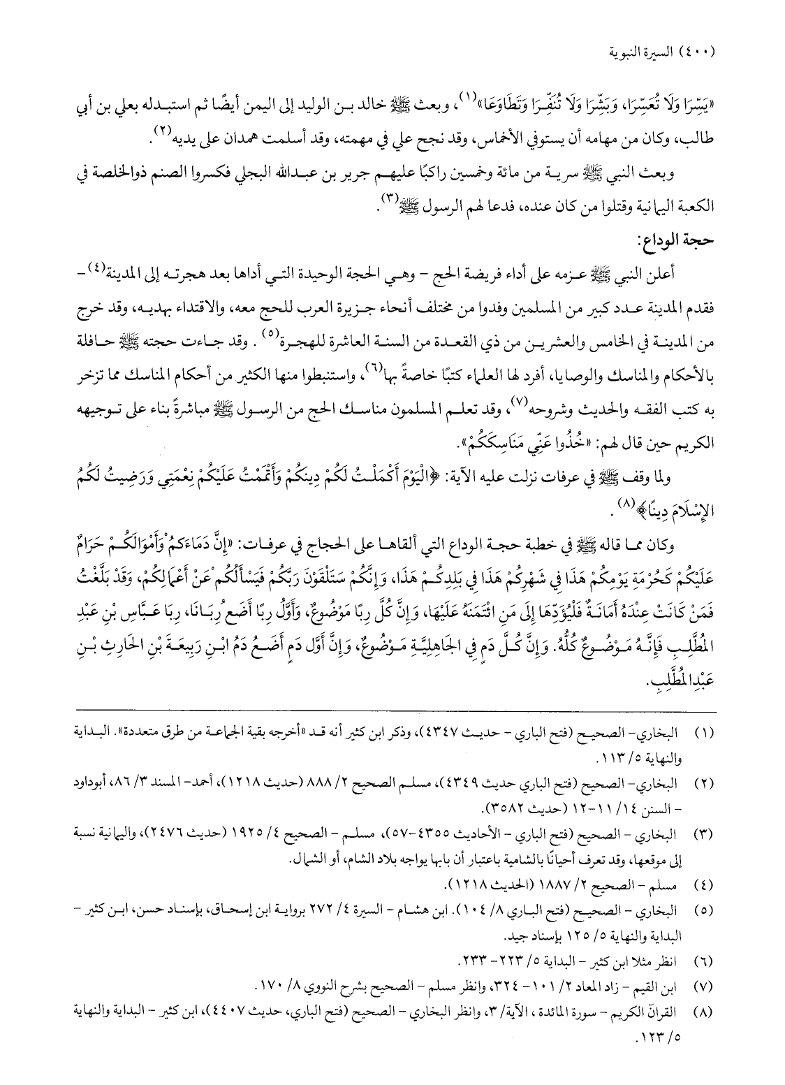 (8) القرآن الكريم- سورة المائدة، الآية/ 3، وانظر البخاري- الصحيح (فتح الباري، حديث 4407) ، ابن كثير- البداية والنهاية 5/ 123.