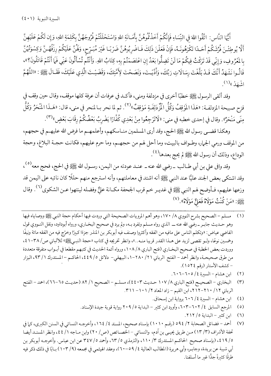 (1) مسلم- الصحيح بشرح النووي 8/ 170، وهو أهم المرويات الصحيحة التي وردت فيها أحكام حجة النبي صلّى الله عليه وسلّم ووصاياه فيها وهو حديث جابر- رضي الله عنه- الذي رواه مسلم وتفرد به، ولم يرد في صحيح البخاري، ورواه أبو داود، ونقل النووي قول القاضي عياض: «وتكلم الناس على ما فيه من الفقه وأكثروا وصنف فيه أبو بكر بن المنذر جزءا كبيرا وخرّج فيه من الفقه مائة ونيفا وخمسين نوعا، ولو تقصى لزيد على هذا القدر قريبا منه ... » ، وانظر تخريجه في كتاب «حجة النبي صلّى الله عليه وسلّم» للألباني ص/ 38- 41، ووردت بعض الخطبة في صحيح البخاري (فتح الباري 8/ 108، ورواه أئمة الحديث في كتبهم مقطعا في أبواب متفرقة متعددة من طرق صحيحة، وانظر أحمد- الفتح الرباني 21/ 280- 1، البيهقي- دلائل 5/ 449، الحاكم- المستدرك 1/ 93، البزار- كشف الأستار (رقم 1524) .