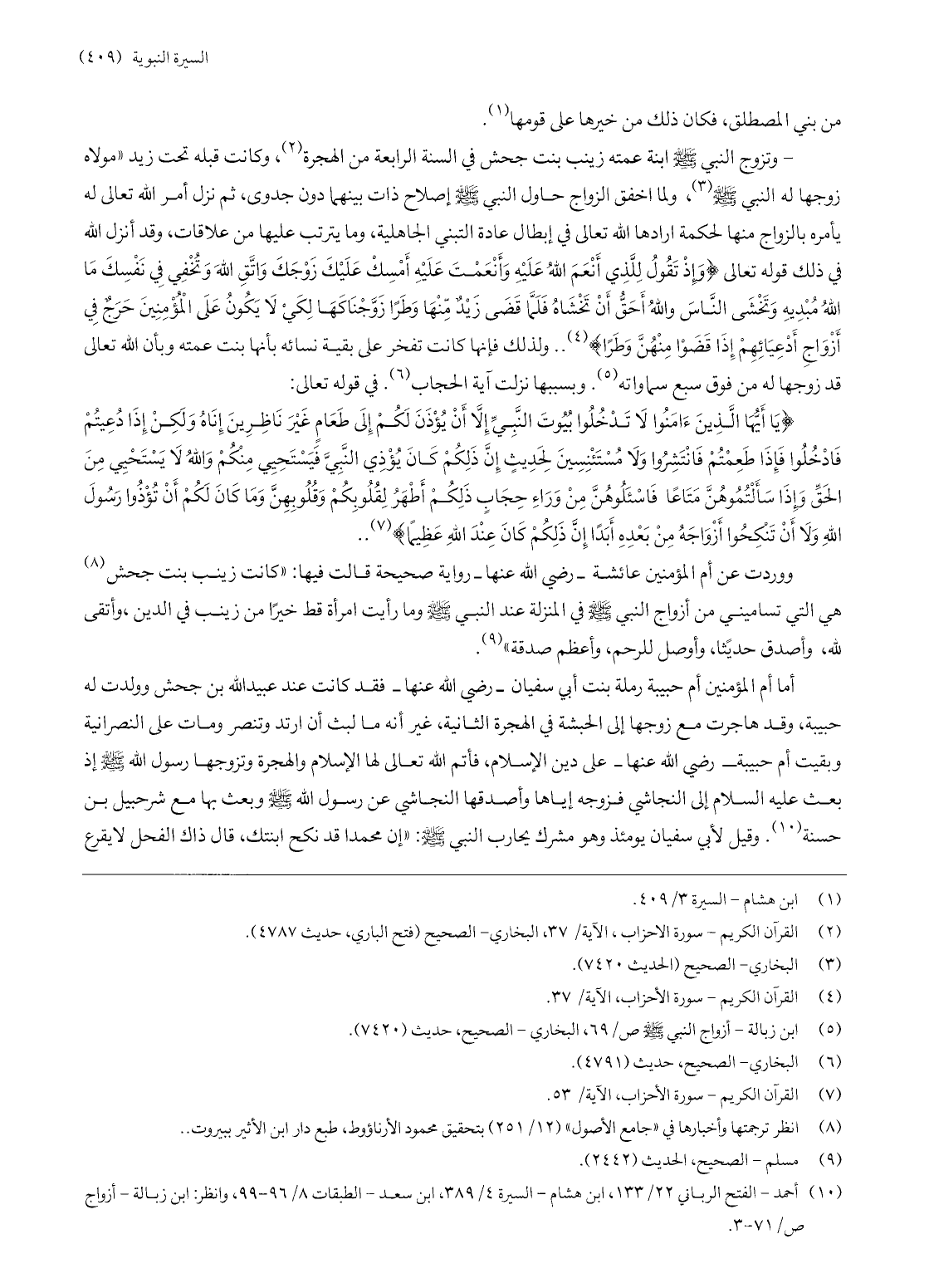 (10) أحمد- الفتح الرباني 22/ 133، ابن هشام- السيرة 4/ 389، ابن سعد- الطبقات 8/ 96- 99، وانظر: ابن زبالة- أزواج ص/ 71- 3.