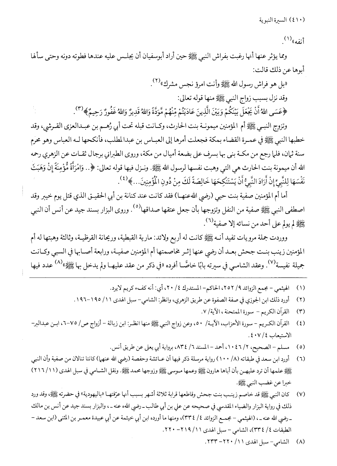 (7) كان النبي صلّى الله عليه وسلّم قد خاصم زينب بنت جحش وقاطعها قرابة ثلاثة أشهر بسبب أنها عرّفتها «باليهودية» في حضرته صلّى الله عليه وسلّم، وقد ورد ذلك في رواية البزار والضياء المقدسي في صحيحه عن علي بن أبي طالب- رضي الله عنه-، والبزار بسند جيد عن أنس بن مالك- رضي الله عنه-، (الهيثمي- مجمع الزوائد 4/ 334) ، ومنها ما أورده ابن أبي خيثمة عن أبي عبيدة معمر بن المثنى (ابن سعد- الطبقات 4/ 334) ، الشامي- سبل الهدى 11/ 219- 220.