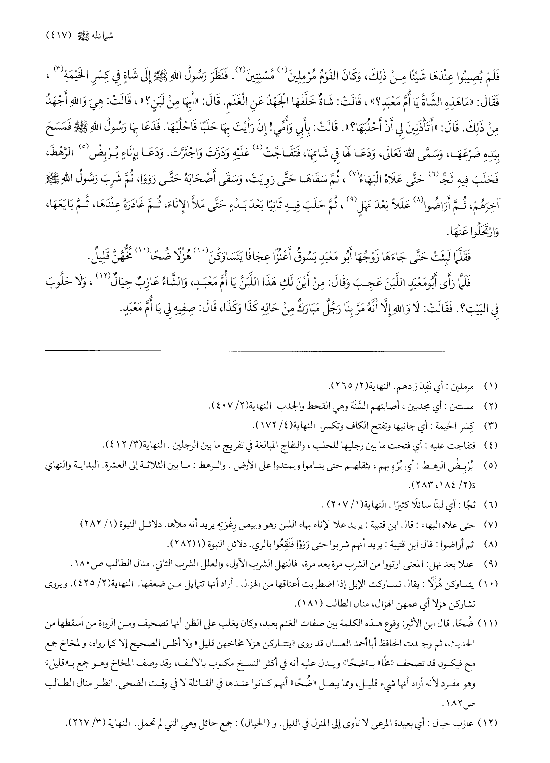 (11) ضحا. قال ابن الأثير: وقوع هذه الكلمة بين صفات الغنم بعيد، وكان يغلب على الظن أنها تصحيف ومن الرواة من أسقطها من الحديث، ثم وجدت الحافظ أبا أحمد العسال قد روى «يتتاركن هزلا مخاخهن قليل» ولا أظن الصحيح إلا كما رواه، والمخاخ جمع مخ فيكون قد تصحف «مخا» ب «ضحا» ويدل عليه أنه في أكثر النسخ مكتوب بالألف، وقد وصف المخاخ وهو جمع ب «قليل» وهو مفرد لأنه أراد أنها شيء قليل، ومما يبطل «ضحا» أنهم كانوا عندها في القائلة لا في وقت الضحى. انظر منال الطالب ص 182.