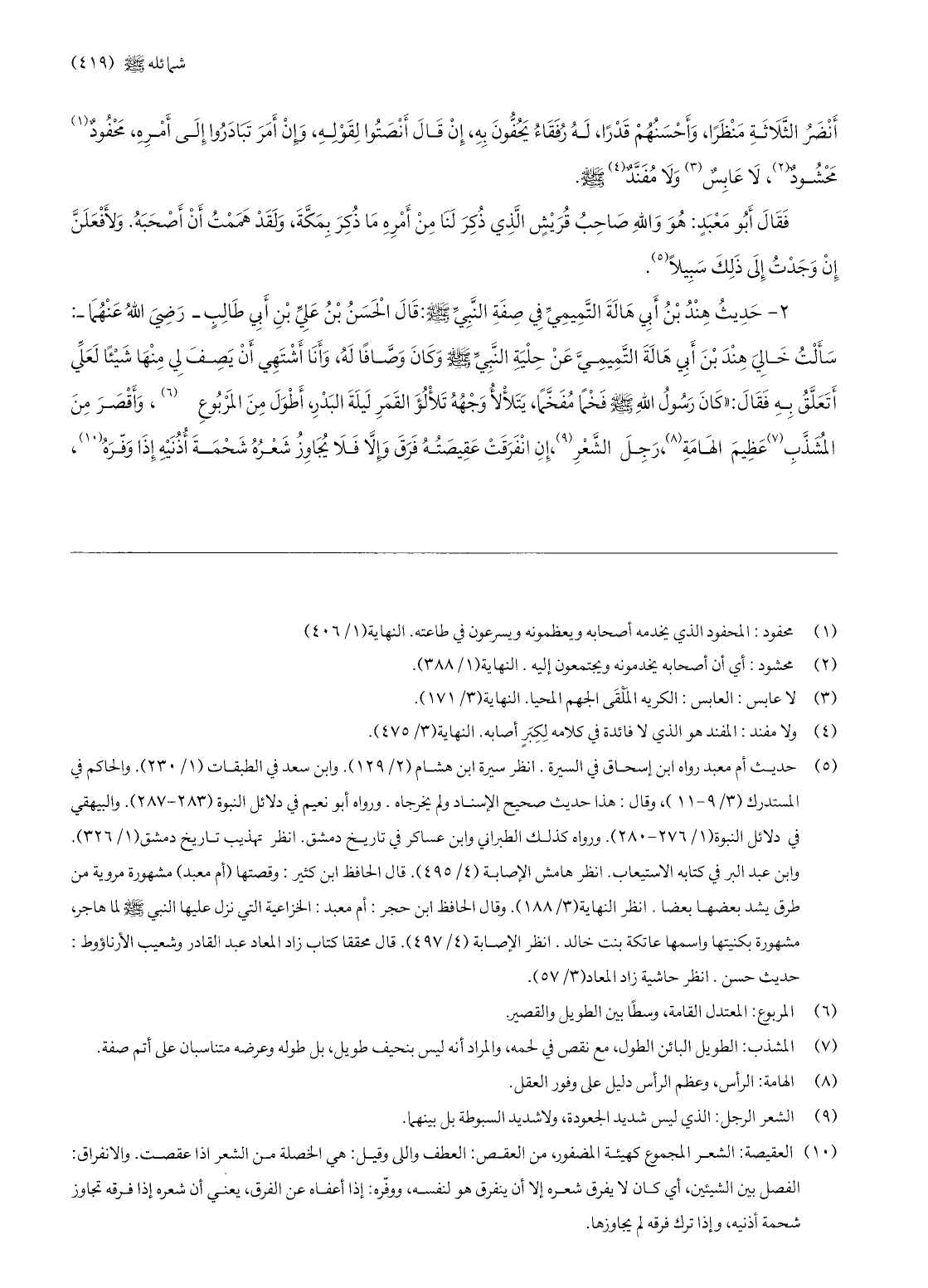2- حديث هند بن أبي هالة التّميميّ في صفة النّبيّ صلّى الله عليه وسلّم: قال الحسن بن عليّ بن أبي طالب- رضي الله عنهما-: