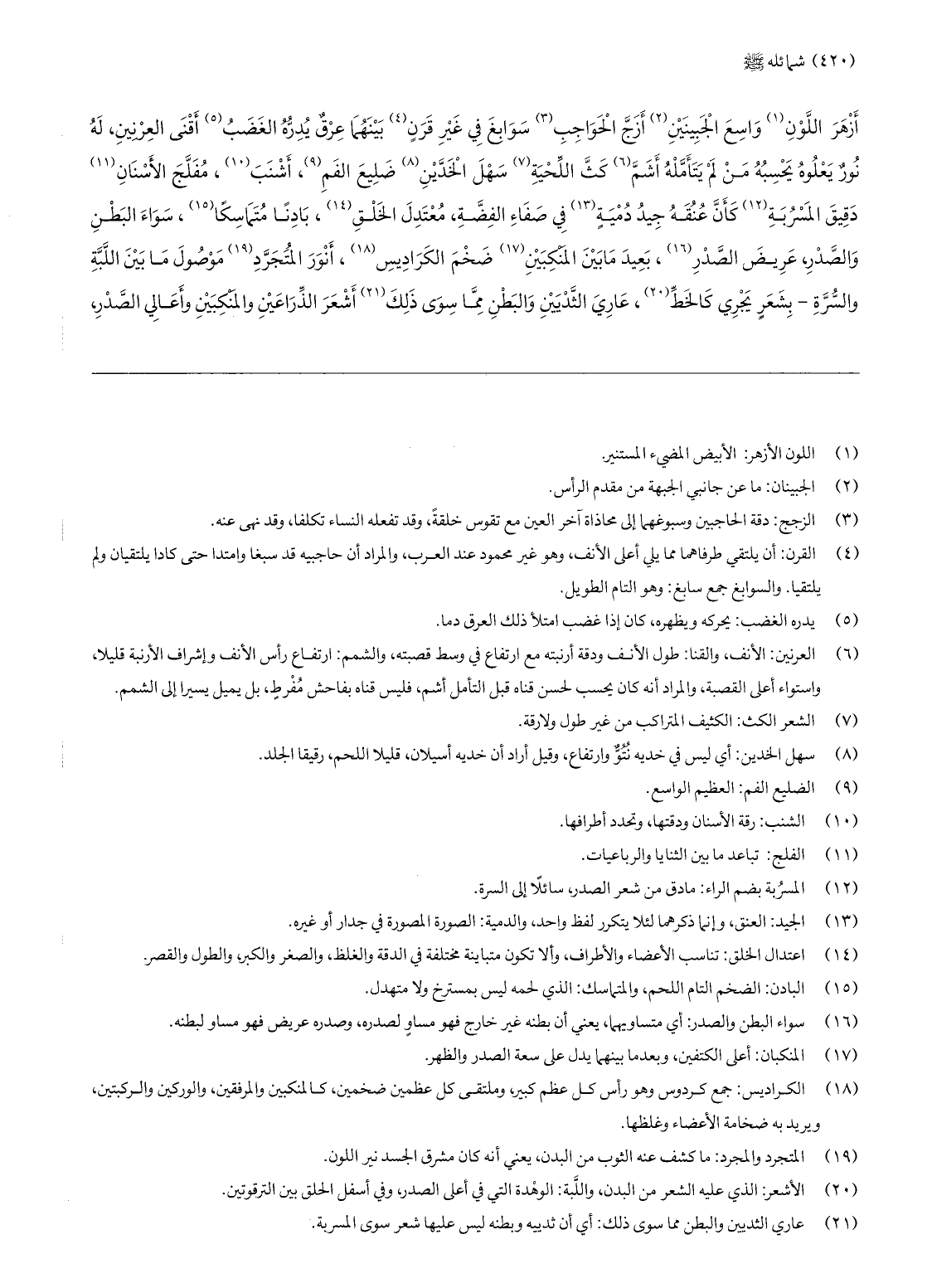 (4) القرن: أن يلتقي طرفاهما مما يلي أعلى الأنف، وهو غير محمود عند العرب، والمراد أن حاجبيه قد سبغا وامتدا حتى كادا يلتقيان ولم يلتقيا. والسوابغ جمع سابغ: وهو التام الطويل.