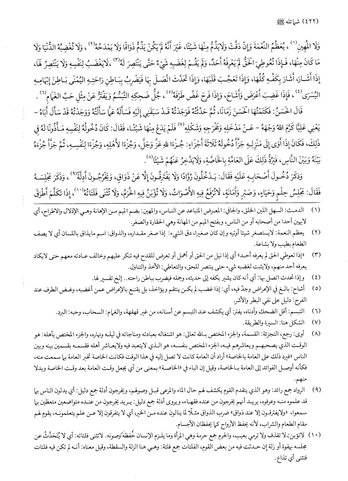 (1) الدمث: السهل اللين الخلق، والجافي: المعرض المتباعد عن الناس، والمهين: بضم الميم من الإهانة وهي الإذلال والاطراح، أي لا يهين أحدا من أصحابه أو من الناس، وبفتح الميم من المهانة وهي الحقارة والصغر.