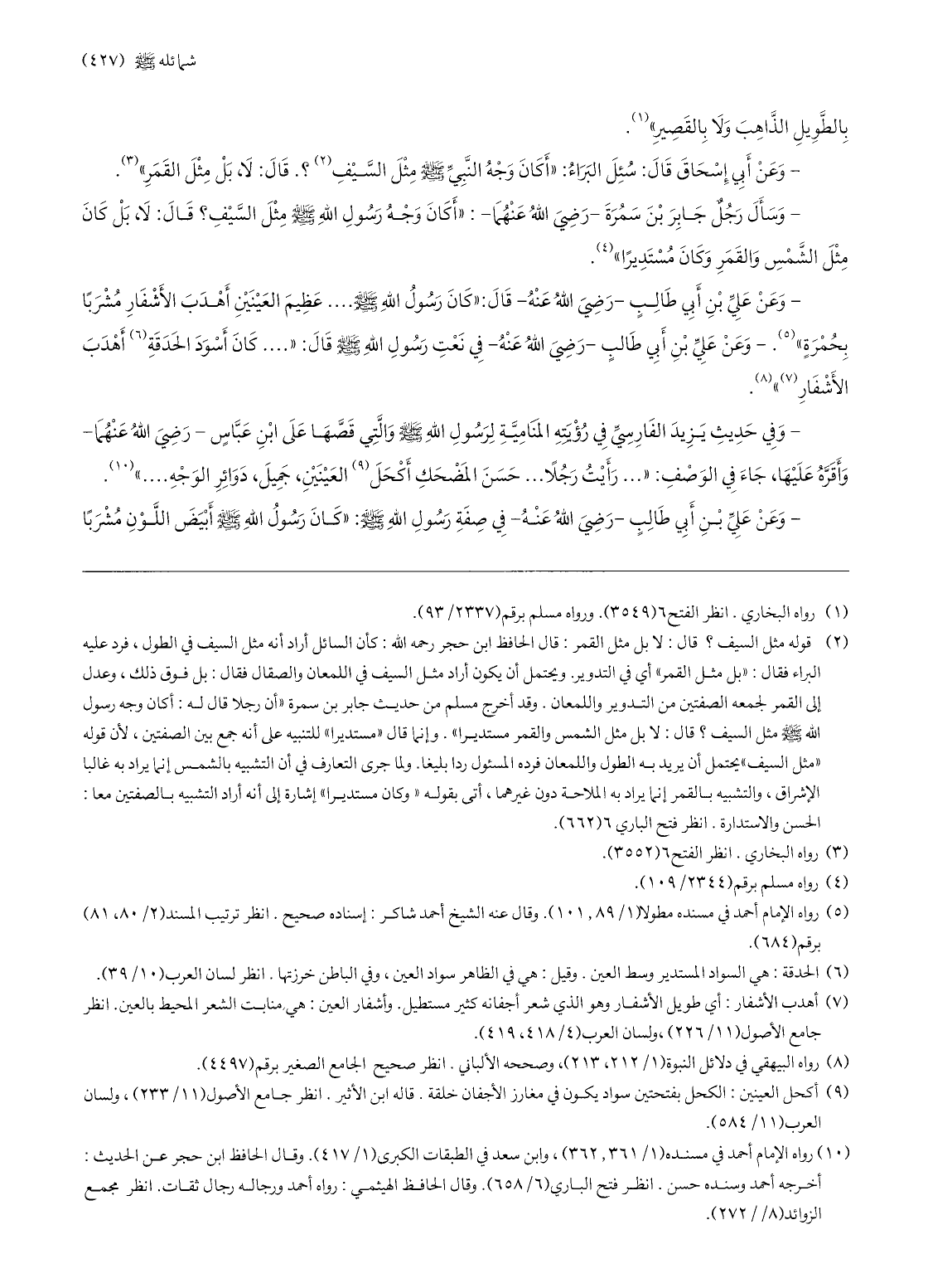 - وعن عليّ بن أبي طالب- رضي الله عنه- قال: «كان رسول الله صلّى الله عليه وسلّم ... عظيم العينين أهدب الأشفار مشربا بحمرة» «5» .- وعن عليّ بن أبي طالب- رضي الله عنه- في نعت رسول الله صلّى الله عليه وسلّم قال: « ... كان أسود الحدقة «6» أهدب الأشفار «7» » «8» .