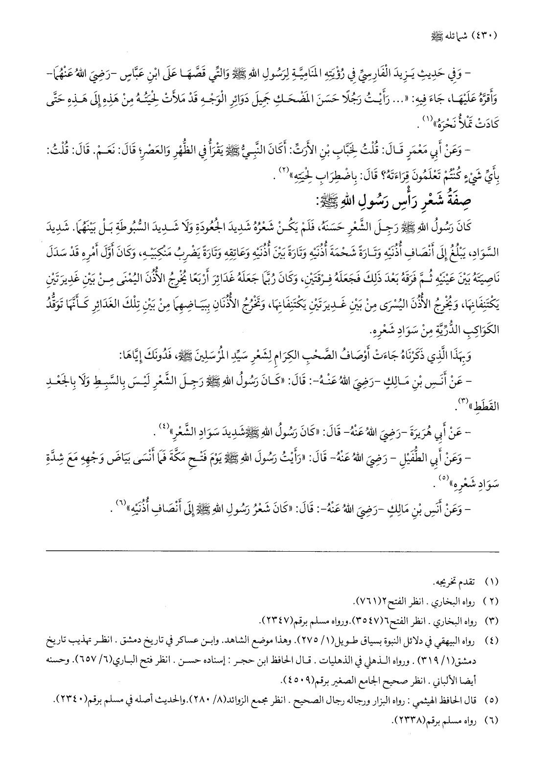 - وعن أنس بن مالك- رضي الله عنه-: قال: «كان شعر رسول الله صلّى الله عليه وسلّم إلى أنصاف أذنيه» «6» .