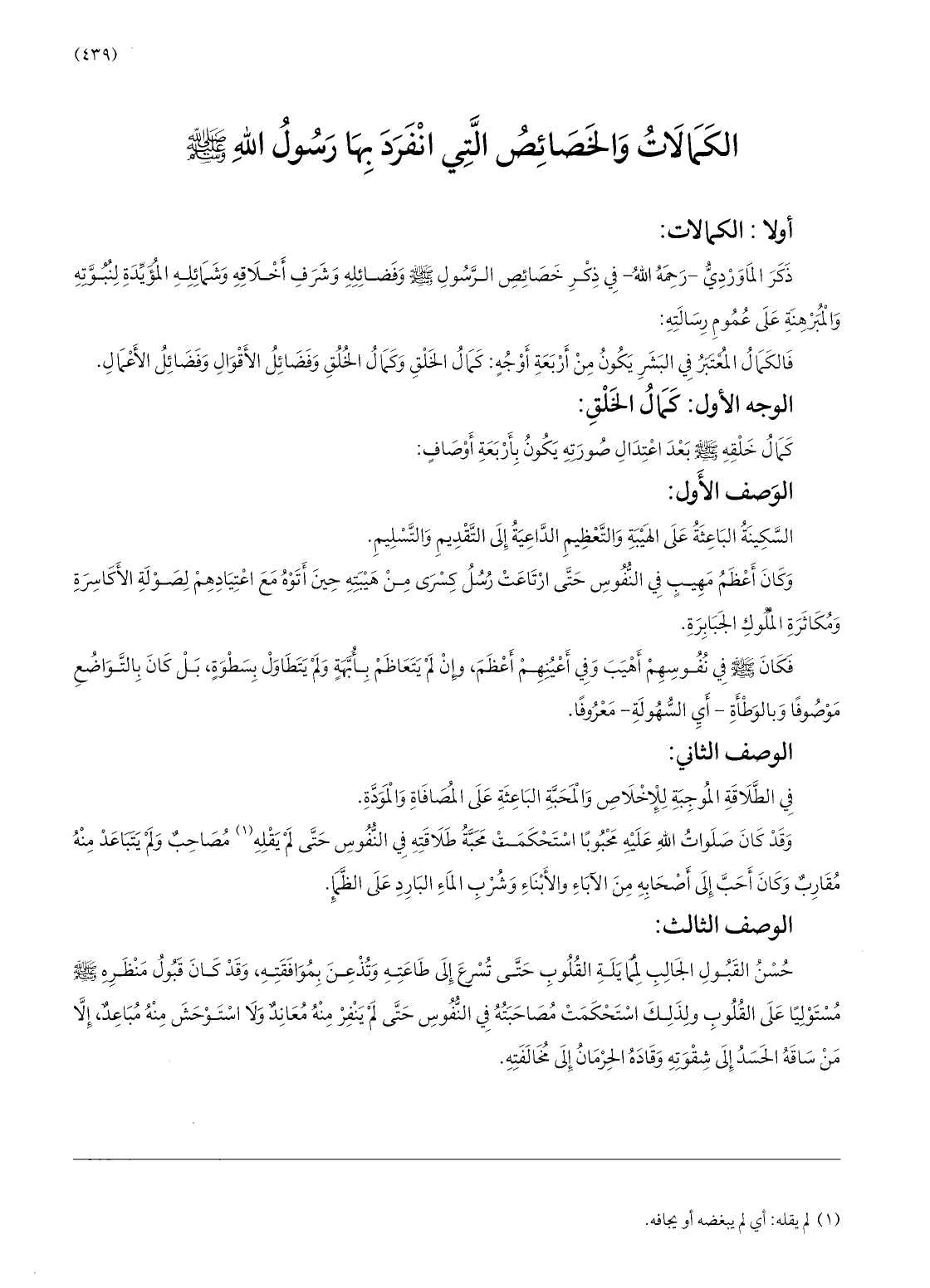 ذكر الماورديّ- رحمه الله- في ذكر خصائص الرّسول صلّى الله عليه وسلّم وفضائله وشرف أخلاقه وشمائله المؤيّدة لنبوّته والمبرهنة على عموم رسالته: