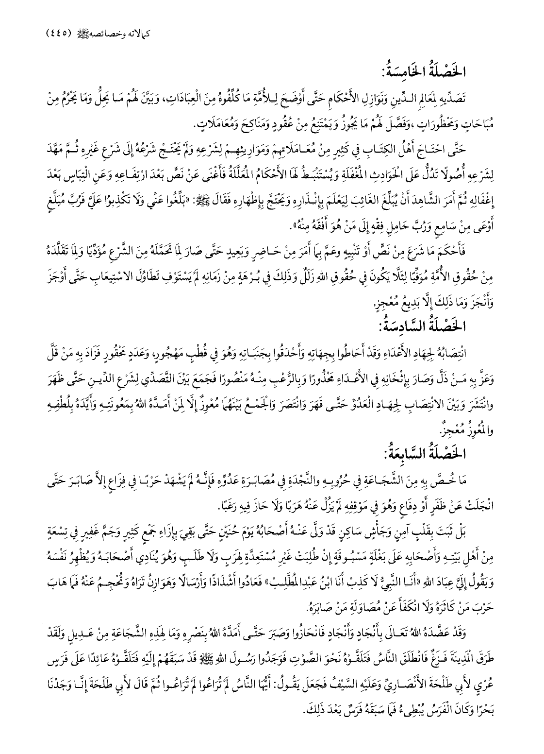 ما خصّ به من الشّجاعة في حروبه والنّجدة في مصابرة عدوّه فإنّه لم يشهد حربا في فزع إلّا صابر حتّى انجلت عن ظفر أو دفاع وهو في موقفه لم يزل عنه هربا ولا حاز فيه رغبا.
