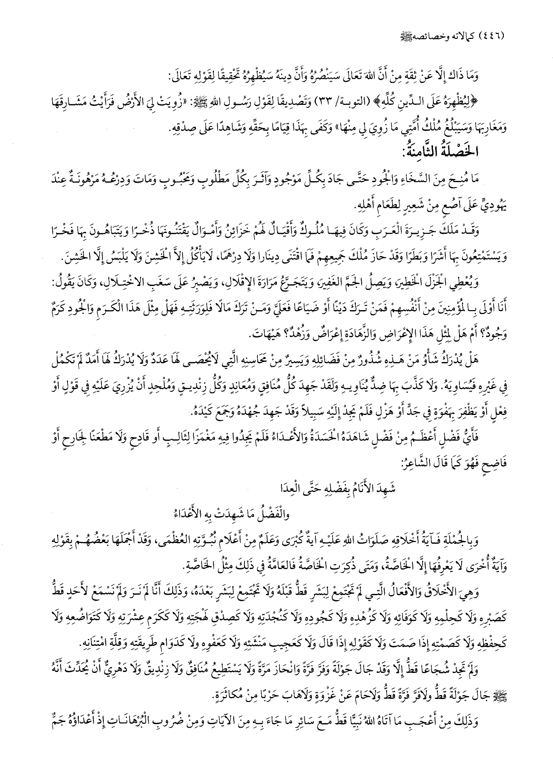 وهي الأخلاق والأفعال الّتي لم تجتمع لبشر قطّ قبله ولا تجتمع لبشر بعده، وذلك أنّا لم نر ولم نسمع لأحد قطّ كصبره ولا كحلمه ولا كوفائه ولا كزهده ولا كجوده ولا كنجدته ولا كصدق لهجته ولا ككرم عشرته ولا كتواضعه ولا كحفظه ولا كصمته إذا صمت ولا كقوله إذا قال ولا كعجيب منشئه ولا كعفوه ولا كدوام طريقته وقلّة امتنانه.