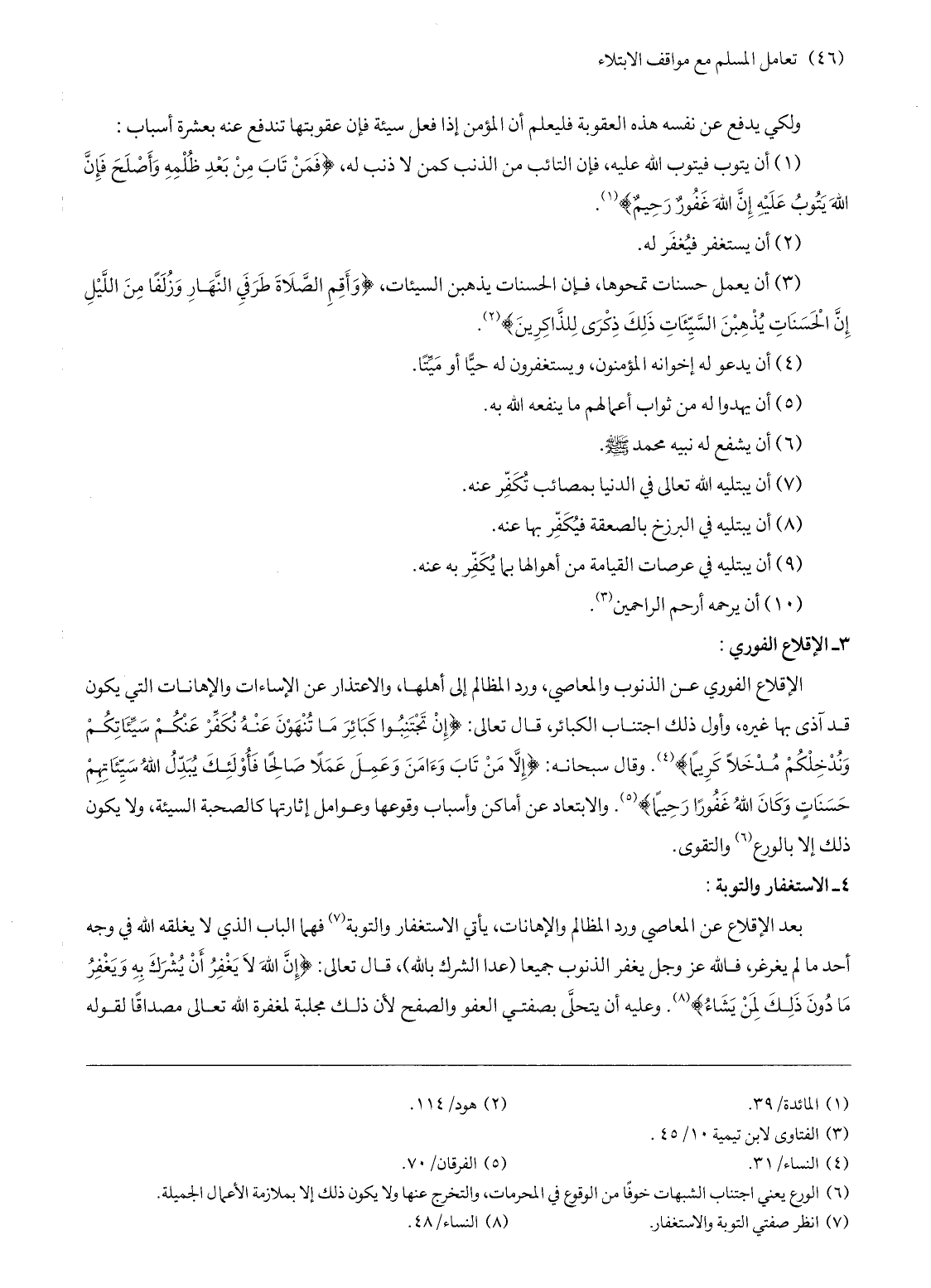 الإقلاع الفوري عن الذنوب والمعاصي، ورد المظالم إلى أهلها، والاعتذار عن الإساءات والإهانات التي يكون قد آذى بها غيره، وأول ذلك اجتناب الكبائر، قال تعالى: إِنْ تَجْتَنِبُوا كَبائِرَ ما تُنْهَوْنَ عَنْهُ نُكَفِّرْ عَنْكُمْ سَيِّئاتِكُمْ وَنُدْخِلْكُمْ مُدْخَلًا كَرِيماً «4» . وقال سبحانه: إِلَّا مَنْ تابَ وَآمَنَ وَعَمِلَ عَمَلًا صالِحاً فَأُوْلئِكَ يُبَدِّلُ اللَّهُ سَيِّئاتِهِمْ حَسَناتٍ وَكانَ اللَّهُ غَفُوراً رَحِيماً «5» . والابتعاد عن أماكن وأسباب وقوعها وعوامل إثارتها كالصحبة السيئة، ولا يكون ذلك إلا بالورع «6» والتقوى.