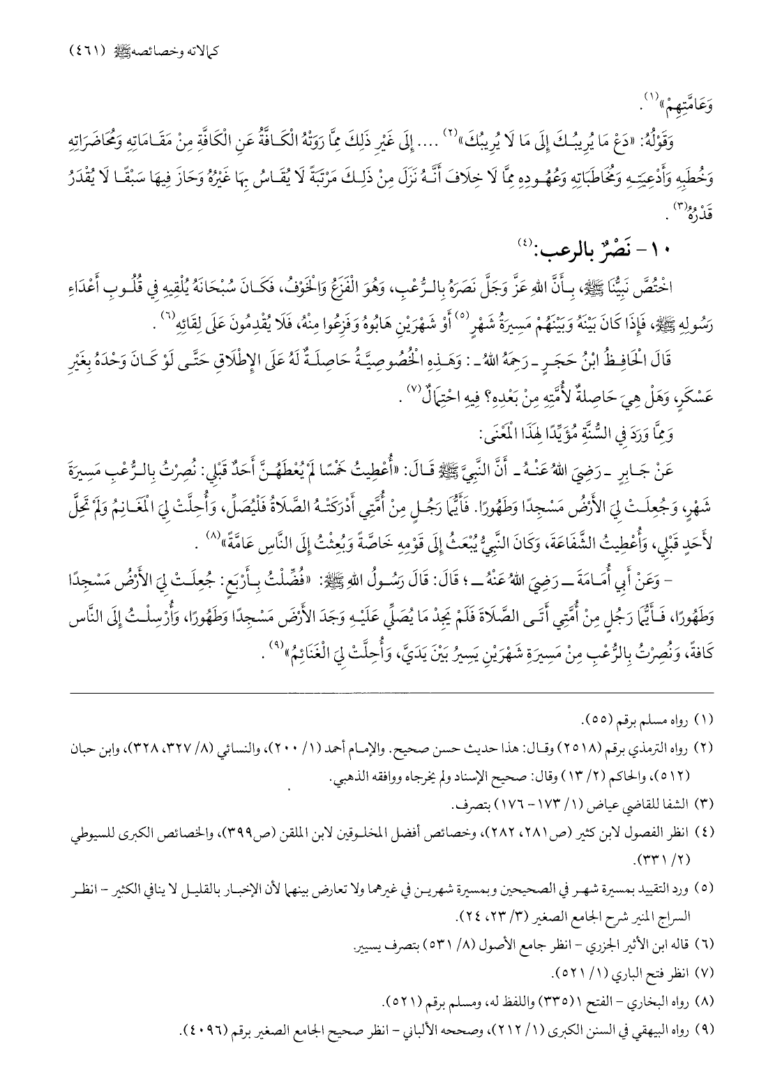 اختصّ نبيّنا صلّى الله عليه وسلّم، بأنّ الله عزّ وجلّ نصره بالرّعب، وهو الفزع والخوف، فكان سبحانه يلقيه في قلوب أعداء رسوله صلّى الله عليه وسلّم، فإذا كان بينه وبينهم مسيرة شهر «5» أو شهرين هابوه وفزعوا منه، فلا يقدمون على لقائه «6» .