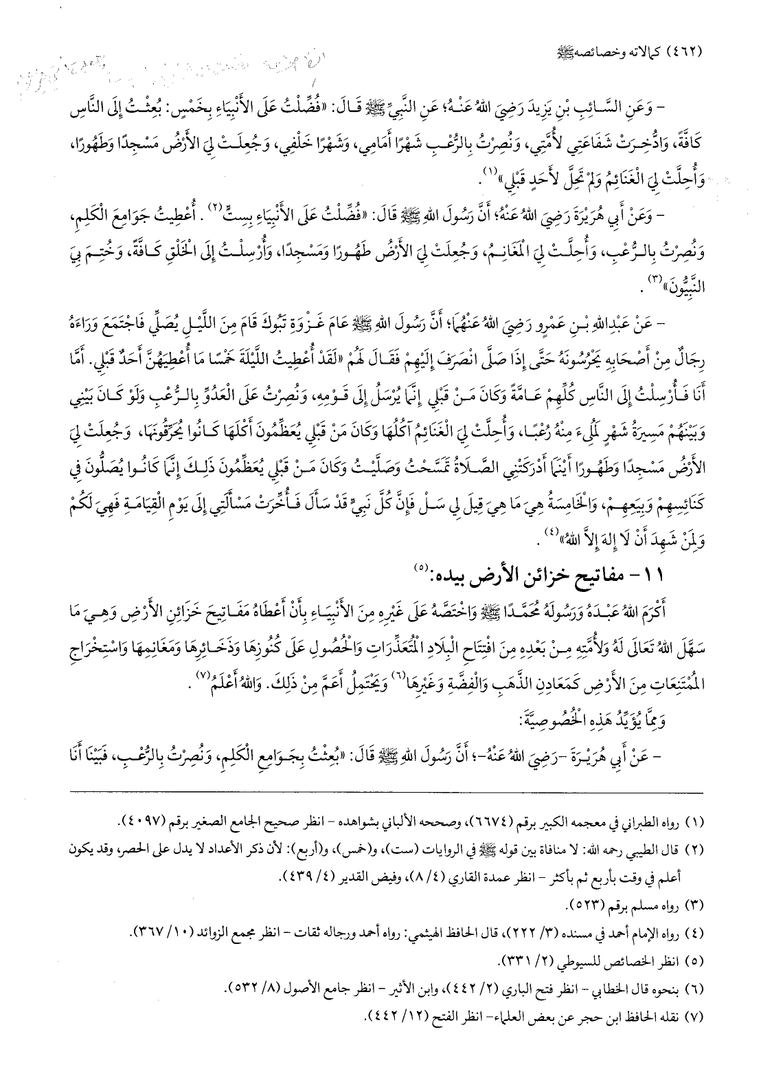 - وعن السّائب بن يزيد رضي الله عنه؛ عن النّبيّ صلّى الله عليه وسلّم قال: «فضّلت على الأنبياء بخمس: بعثت إلى النّاس كافّة، وادّخرت شفاعتي لأمّتي، ونصرت بالرّعب شهرا أمامي، وشهرا خلفي، وجعلت لي الأرض مسجدا وطهورا، وأحلّت لي الغنائم ولم تحلّ لأحد قبلي» «1» .