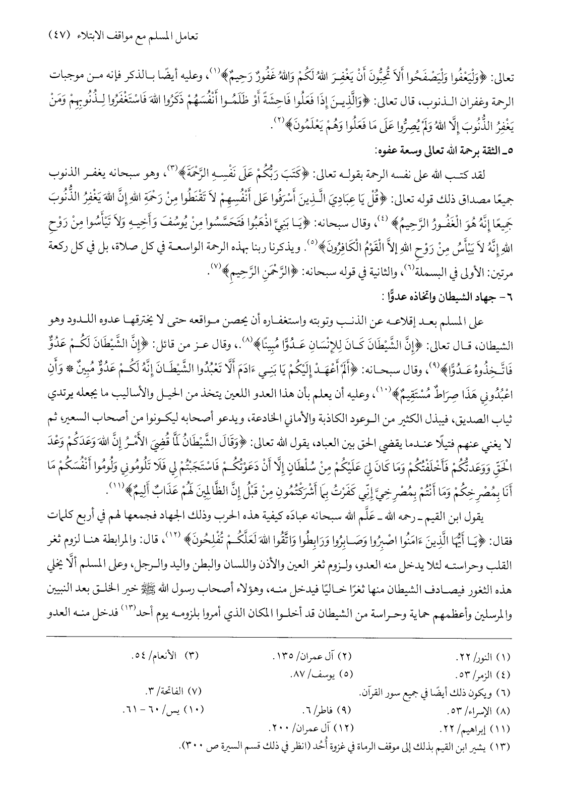 على المسلم بعد إقلاعه عن الذنب وتوبته واستغفاره أن يحصن مواقعه حتى لا يخترقها عدوه اللدود وهو الشيطان، قال تعالى: إِنَّ الشَّيْطانَ كانَ لِلْإِنْسانِ عَدُوًّا مُبِيناً «8» .، وقال عز من قائل: إِنَّ الشَّيْطانَ لَكُمْ عَدُوٌّ فَاتَّخِذُوهُ عَدُوًّا «9» ، وقال سبحانه: أَلَمْ أَعْهَدْ إِلَيْكُمْ يا بَنِي آدَمَ أَنْ لا تَعْبُدُوا الشَّيْطانَ إِنَّهُ لَكُمْ عَدُوٌّ مُبِينٌ* وَأَنِ اعْبُدُونِي هذا صِراطٌ مُسْتَقِيمٌ «10» ، وعليه أن يعلم بأن هذا العدو اللعين يتخذ من الحيل والأساليب ما يجعله يرتدي ثياب الصديق، فيبذل الكثير من الوعود الكاذبة والأماني الخادعة، ويدعو أصحابه ليكونوا من أصحاب السعير، ثم لا يغني عنهم فتيلا عند ما يقضي الحق بين العباد، يقول الله تعالى: وَقالَ الشَّيْطانُ لَمَّا قُضِيَ الْأَمْرُ إِنَّ اللَّهَ وَعَدَكُمْ وَعْدَ الْحَقِّ وَوَعَدْتُكُمْ فَأَخْلَفْتُكُمْ وَما كانَ لِي عَلَيْكُمْ مِنْ سُلْطانٍ إِلَّا أَنْ دَعَوْتُكُمْ فَاسْتَجَبْتُمْ لِي فَلا تَلُومُونِي وَلُومُوا أَنْفُسَكُمْ ما أَنَا بِمُصْرِخِكُمْ وَما أَنْتُمْ بِمُصْرِخِيَّ إِنِّي كَفَرْتُ بِما أَشْرَكْتُمُونِ مِنْ قَبْلُ إِنَّ الظَّالِمِينَ لَهُمْ عَذابٌ أَلِيمٌ «11» .